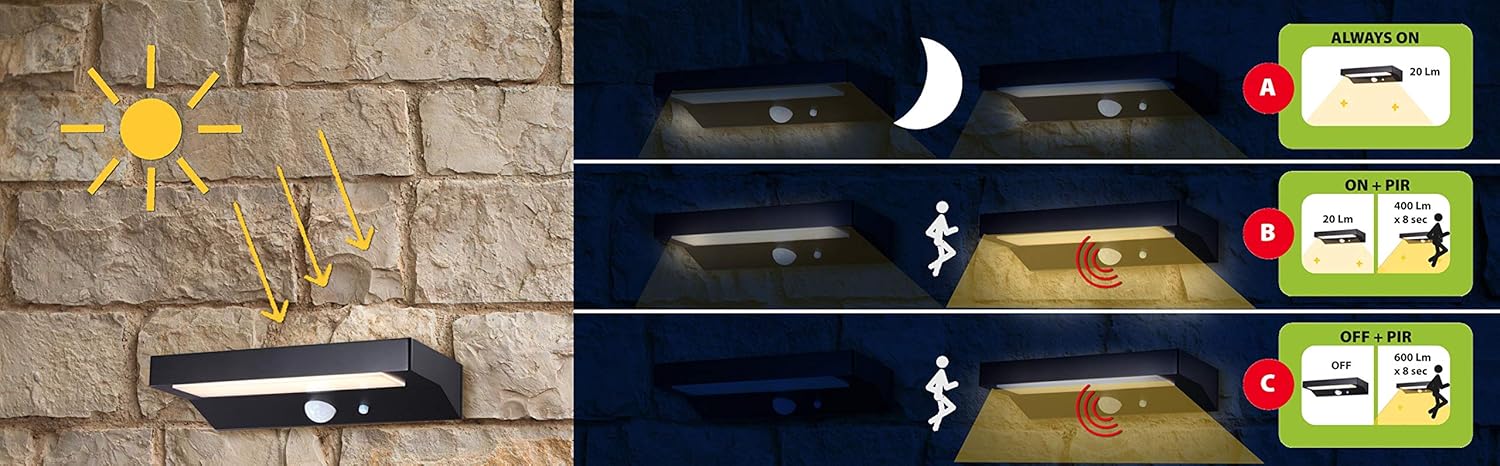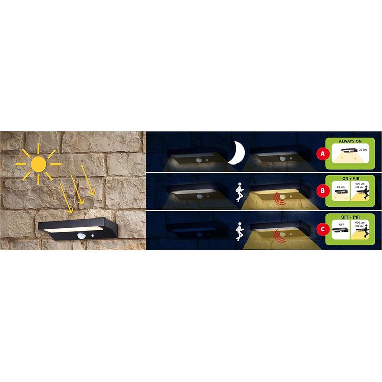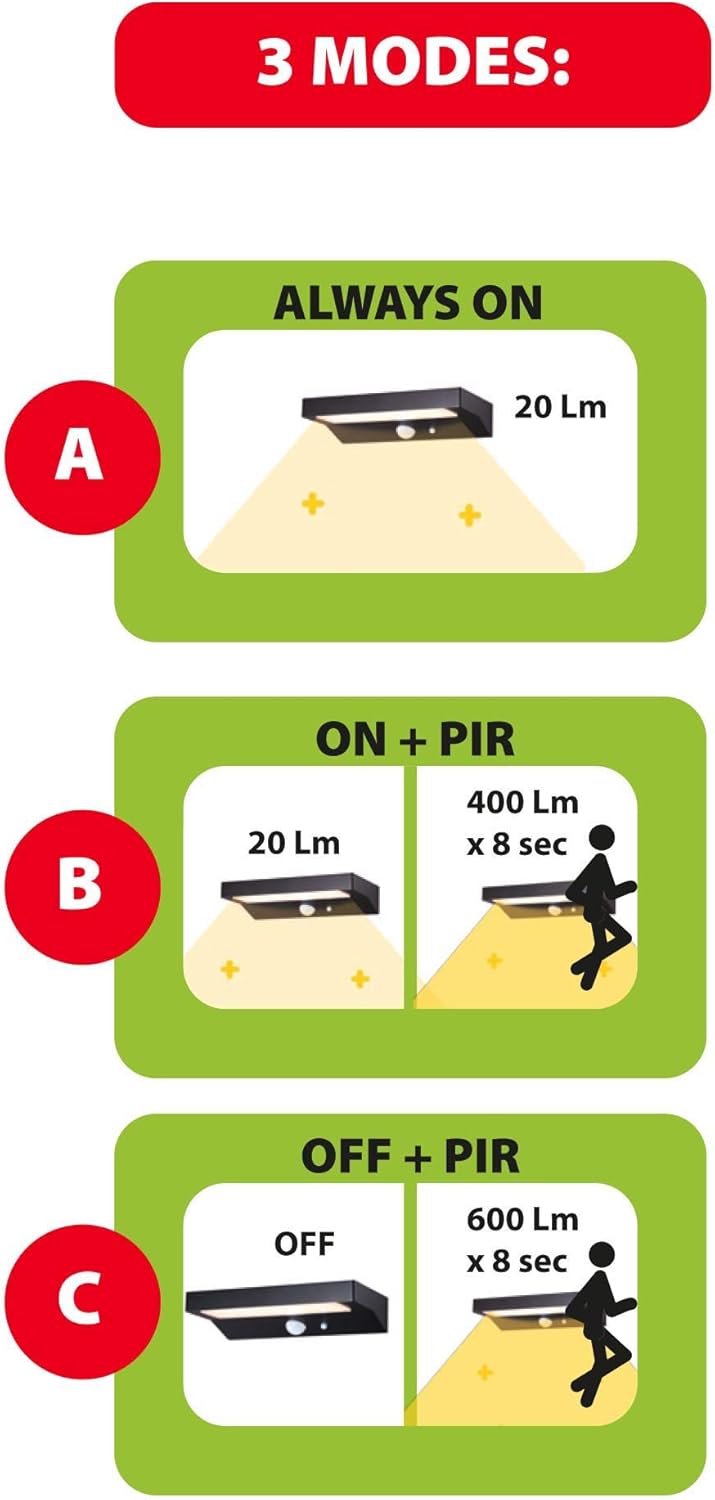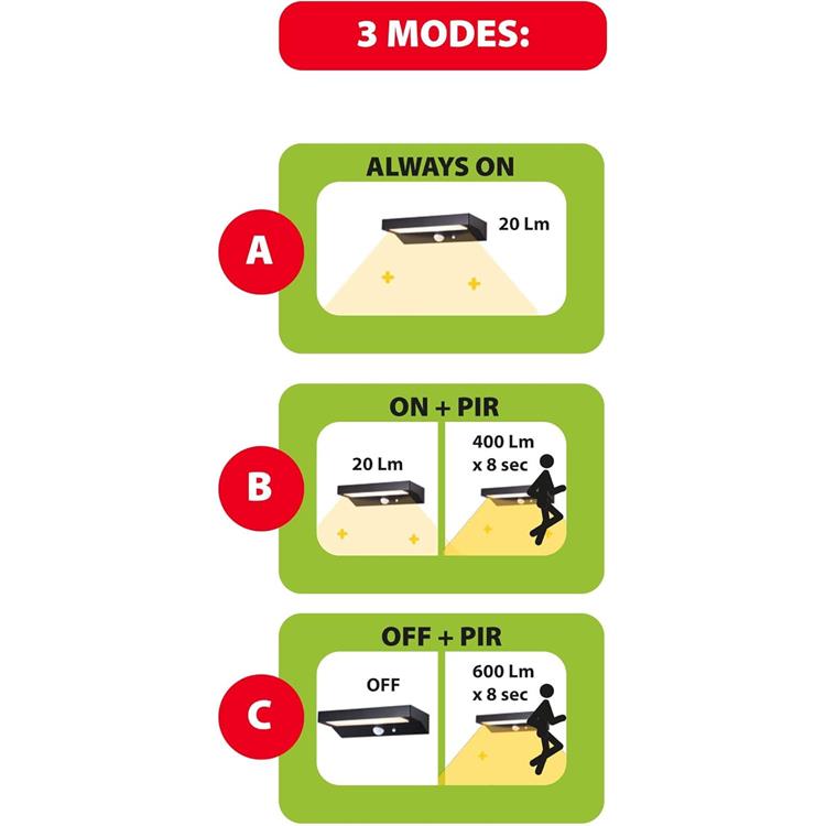 - 2 – modalità mista: la luce si accende automaticamente al calare del sole assicurando 20 lumen continui e si spegne all’alba; laddove venga rilevato un movimento il sensore si attiva e la luce aumenta l’intensità dell’illuminazione a 400 lumen per 8 secondi.