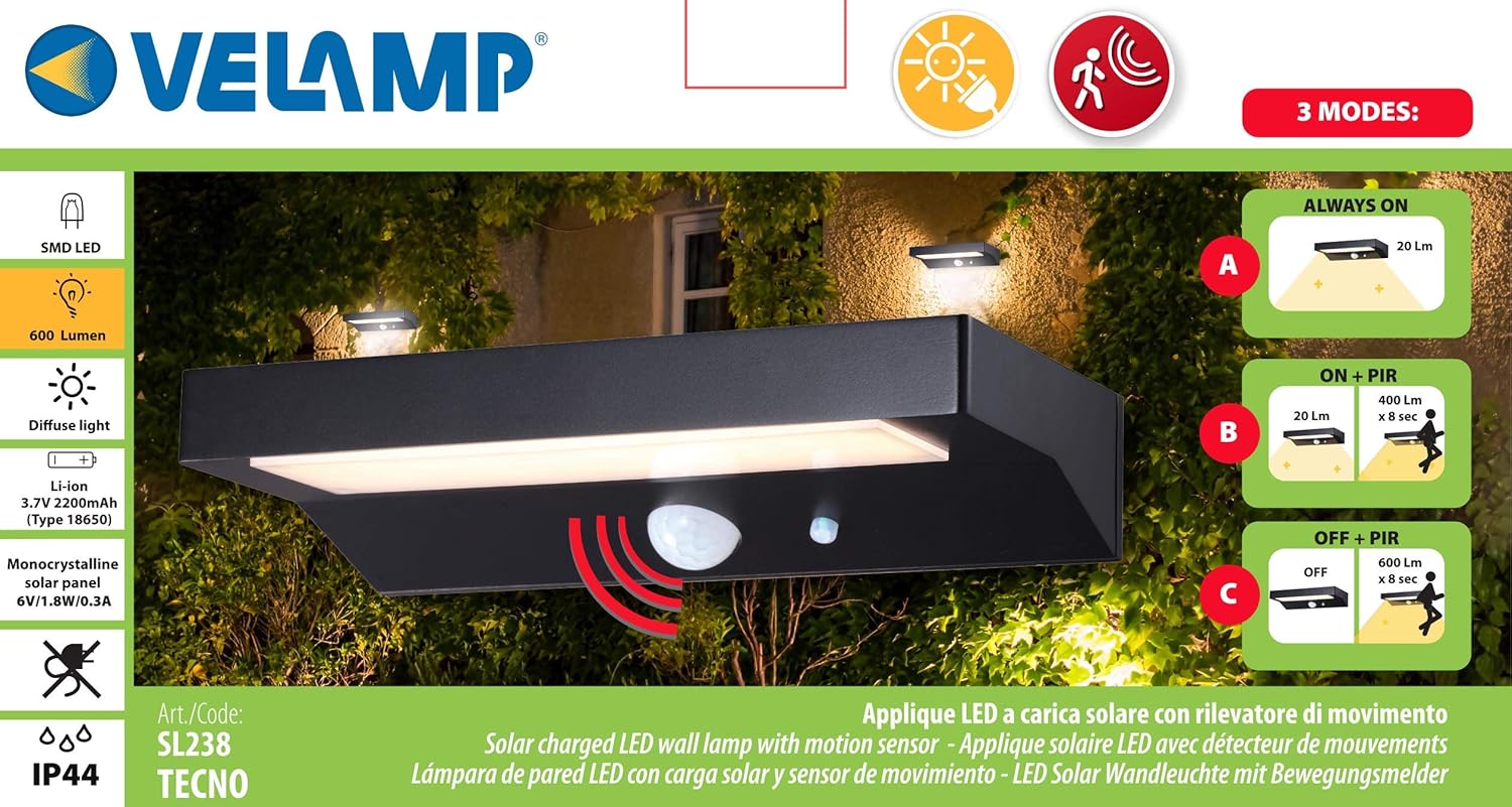 APPLIQUE SOLARE DA ESTERNO CON SENSORE DI MOVIMENTO - TECNO - 600 LUMEN