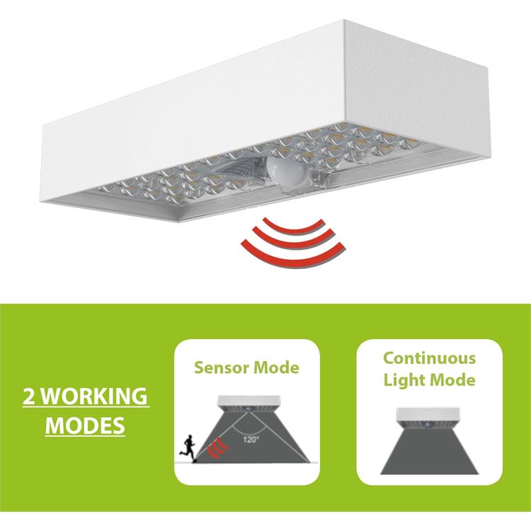 2 – modalità applique con sensore di movimento: la lampada si accende automaticamente di notte al 100% di luminosità quando viene rilevato un movimento in una distanza inferiore o uguale a 6 metri, per poi passare al 5% di luminosità dopo 20 secondi in cui non viene rilevato alcun movimento.