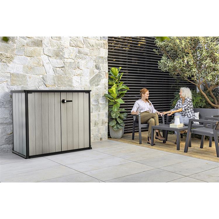 Nonostante le sue dimensioni compatte, Patio Store può contenere fino a due bidoni con 120 litri di capacità, offrendo un ampio spazio per riporre attrezzi da giardino, cuscini da esterno, giochi per bambini e molto altro.
