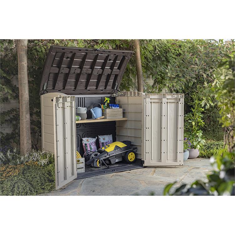 - Armadio porta attrezzi da giardino in resina con finitura effetto legno