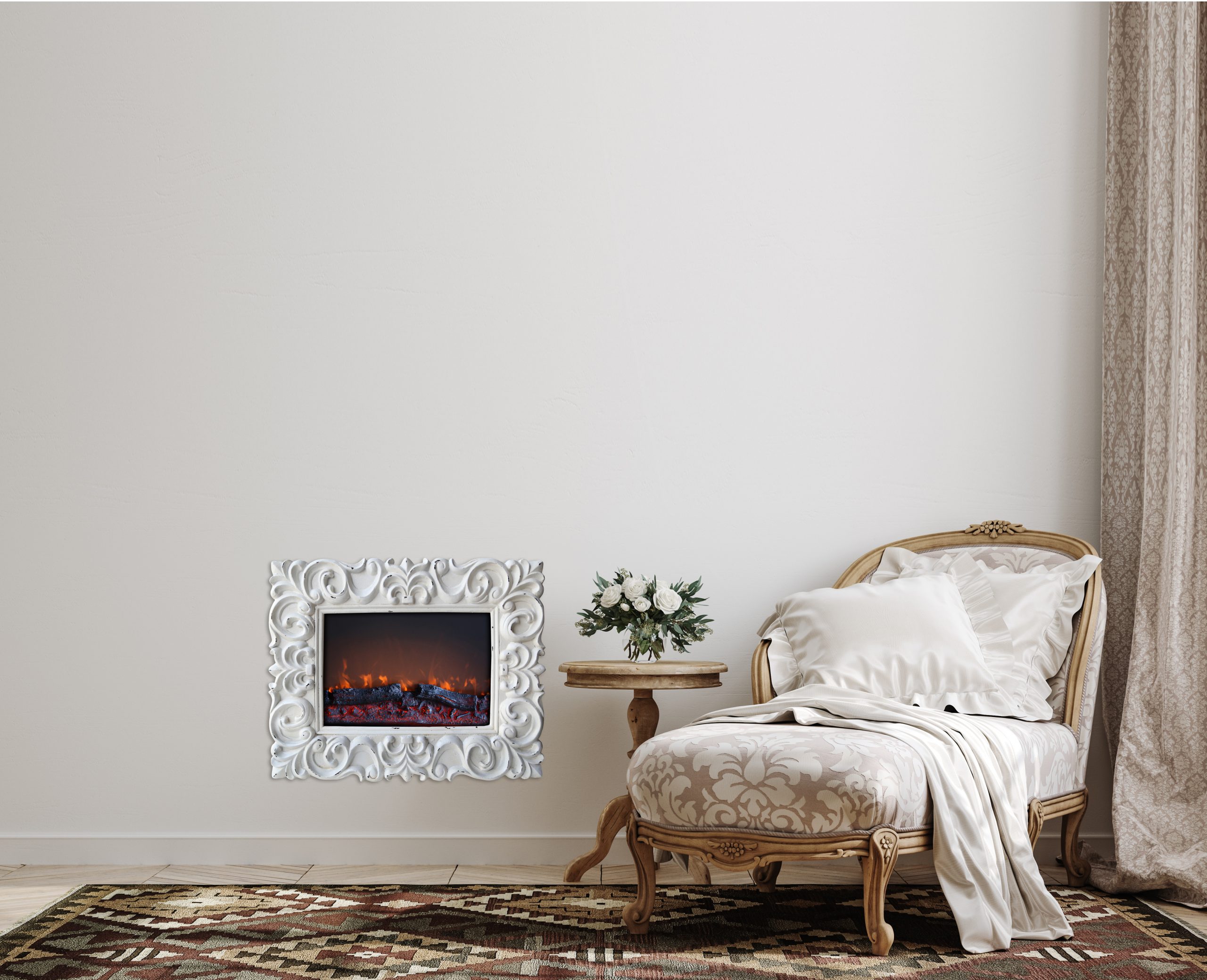 Il camino elettrico Chic trova la sua perfetta ubicazione come elemento d'arredo e fonte di calore in salotti e camere da letto. Grazie alla sua cornice lavorata con effetto shabby, è appropriato non solo per case con arredo classico o provenzale, ma anche all’interno di locali, ristoranti e boutique che desiderano un tocco di eleganza retrò. Essendo una stufa a camino elettrico da appendere, ottimizza lo spazio e può essere installato ovunque sia presente una presa elettrica.