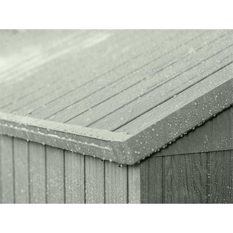 Realizzata in EVOTECH+, una resina innovativa che riproduce fedelmente l'aspetto del legno naturale, questa casetta vanta una struttura solida e durevole, in grado di resistere a pioggia, neve (fino a 75 kg/m²) e raggi UV.