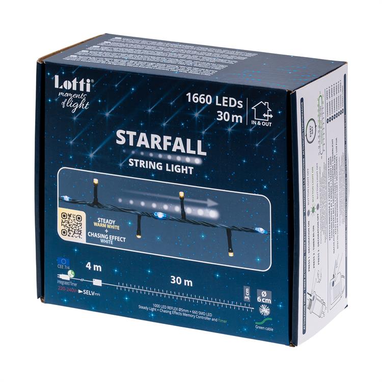 Questa catena luminosa da esterno si estende per 30 metri, portando con sé la promessa di un Natale indimenticabile. Con ben 1660 LED di alta qualità (composti da 1000 LED Bianco Caldo Ø5 mm Reflex a Luce Fissa + 660 SMD LED Bianco Freddo con Memory Controller Luce Fissa + Effetto Rincorsa a 7 velocità). I 1000 LED a luce fissa Bianco Caldo creano una base accogliente e tradizionale, mentre 660 SMD LED Bianco Freddo introducono uno scintillio glaciale e l'effetto rincorsa.