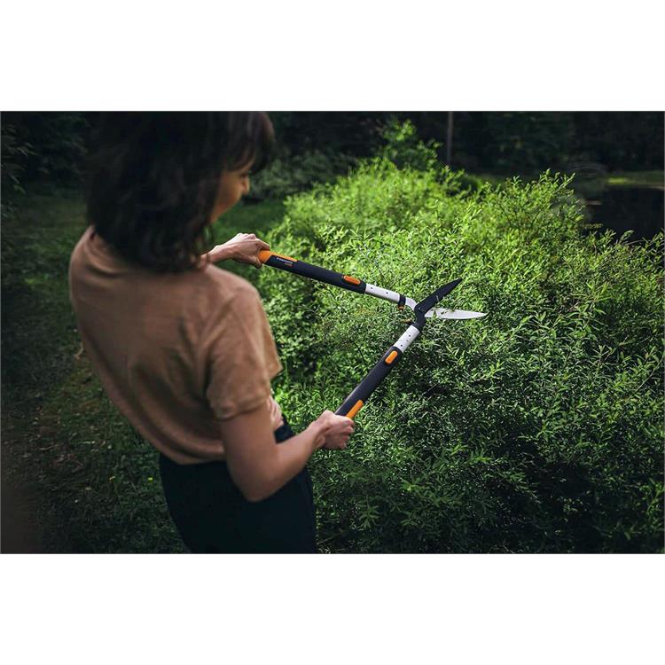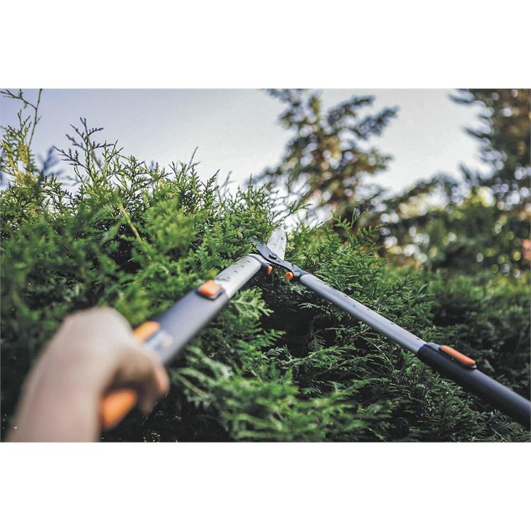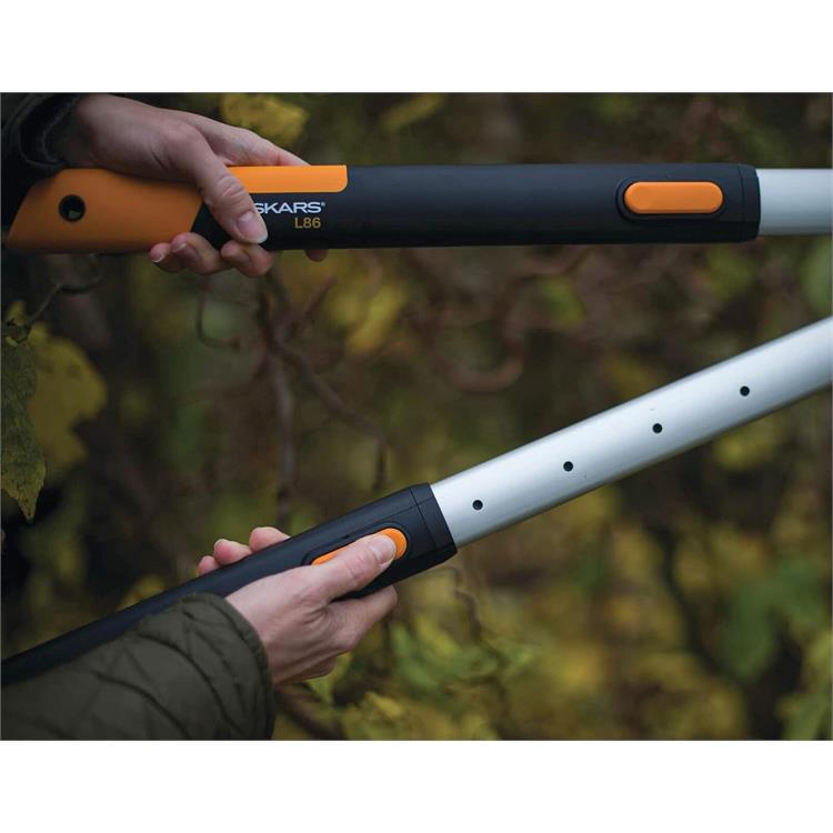 La vera forza delle cesoie Fiskars HS86 risiede, infatti, nella combinazione di leggerezza e robustezza. I manici telescopici in alluminio non solo garantiscono un'estensione significativa, ma mantengono anche l'attrezzo sorprendentemente leggero e maneggevole, riducendo l'affaticamento durante l'uso prolungato. Le impugnature ergonomiche, realizzate in materiale plastico antiscivolo SoftGrip™, offrono una presa salda e confortevole, assicurando un controllo ottimale in ogni situazione. Potrai lavorare in altezza con precisione e sicurezza, senza compromettere il comfort e la manovrabilità.