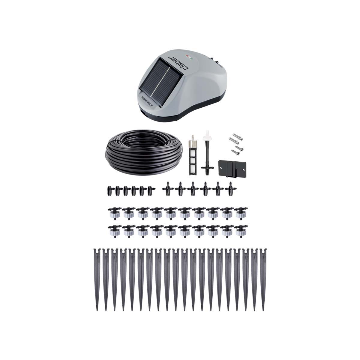 - Programmatore solare con pompa integrata: dotato di pannello fotovoltaico che assorbe l'energia del sole e la trasforma in energia elettrica per alimentare la pompa. La pompa aspira l'acqua da un serbatoio, la filtra e la distribuisce ai gocciolatori.
