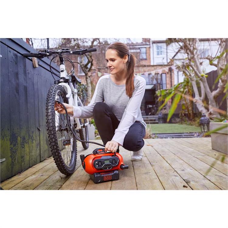 Il compressore portatile BD BDCINF18N-QS è indispensabile per ogni appassionato di fai da te e per chi desidera una soluzione versatile per le proprie esigenze di gonfiaggio. Questo modello, potente e compatto, si distingue per la sua triplice alimentazione: può essere utilizzato comodamente a casa grazie alla spina 230V, in auto grazie all'adattatore 12V e persino in campeggio o in giardino con la possibilità di alimentazione tramite batteria 18V al Litio (non inclusa).