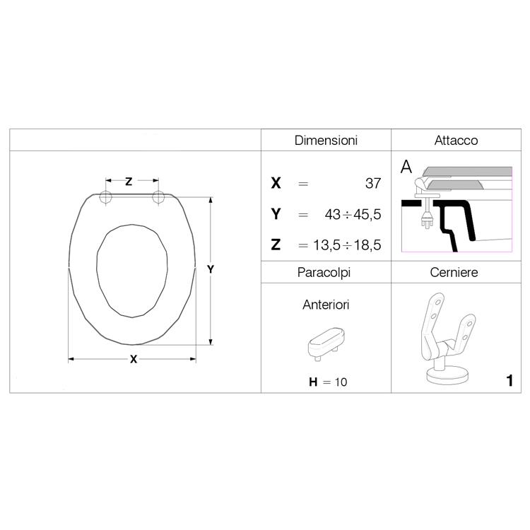 Le cerniere universali in zama garantiscono una lunga durata e una regolazione precisa, permettendo di adattare il copriwater a diverse forme di vaso.