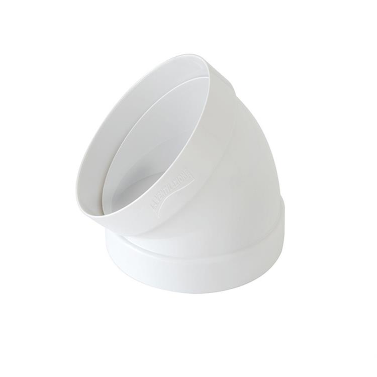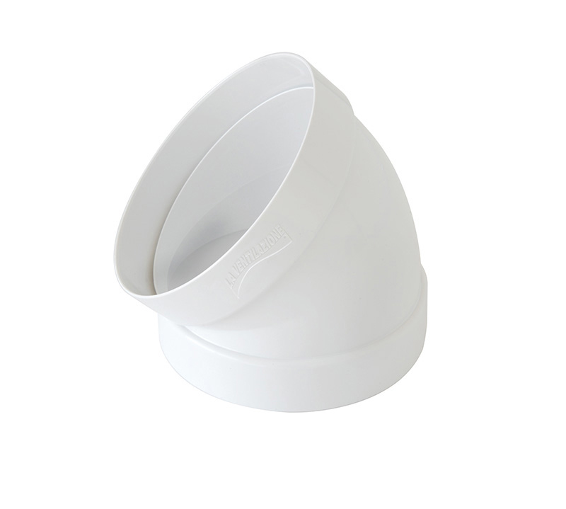Curva in ABS per tubo tondo da 125 mm con angolo 45°, ideale per la direzione della canalizzazione in cucine e bagni.