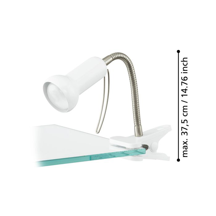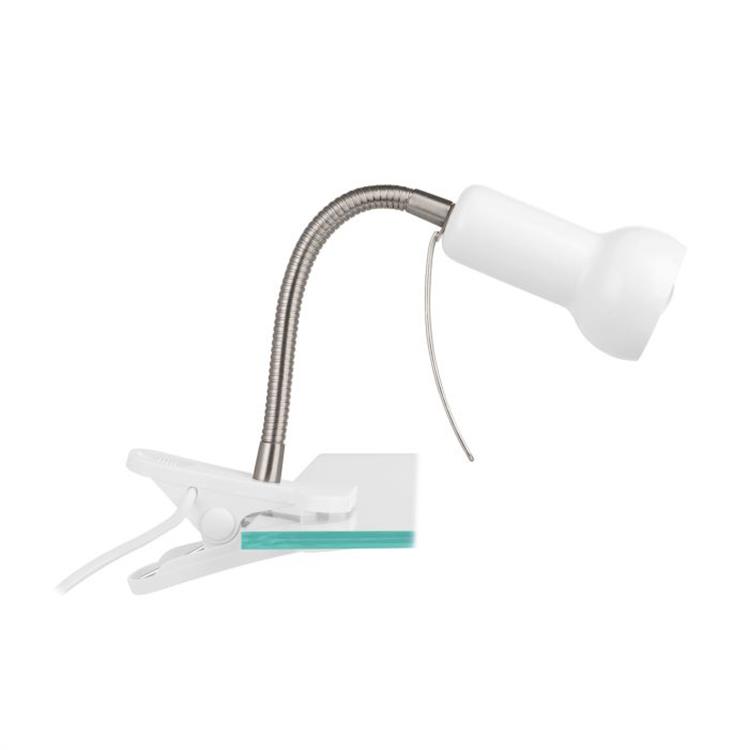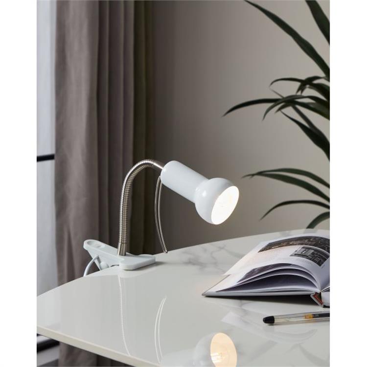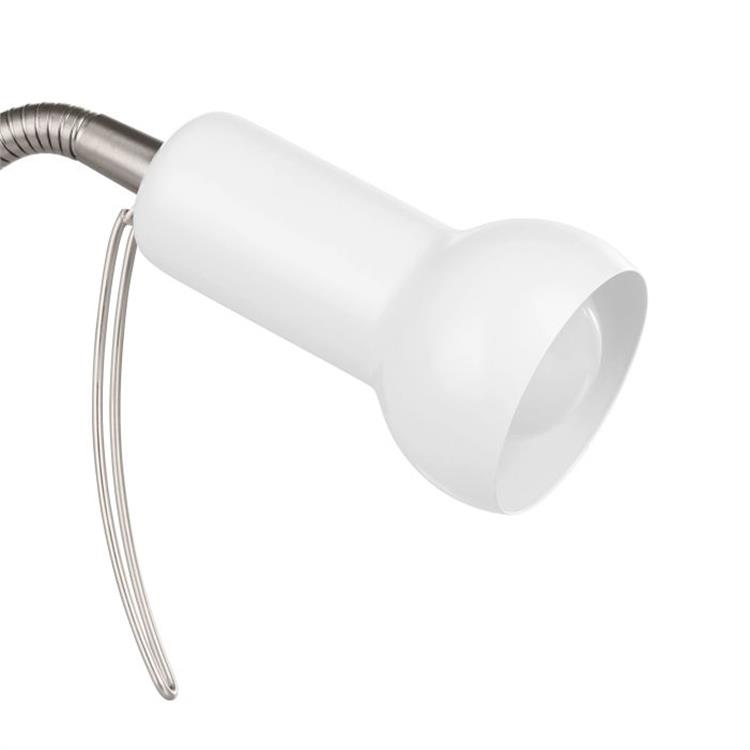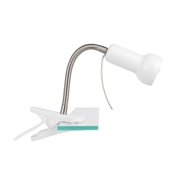 La lampada a pinza FABIO è un faretto a pinza per chi cerca un'illuminazione mirata. La struttura, in metallo bianco e argento, è discreta. Questo faretto led orientabile può essere posizionato in qualsiasi punto della casa o dell'ufficio grazie alla pinza regolabile. Il braccio mobile e il collo flessibile ti permettono di direzionare la luce dove preferisci, illuminando una scrivania, un piano di lavoro o un libro. La lampada si accende e si spegne facilmente con un interruttore sul cavo. La lampada non include la lampadina e ha un attacco E14.