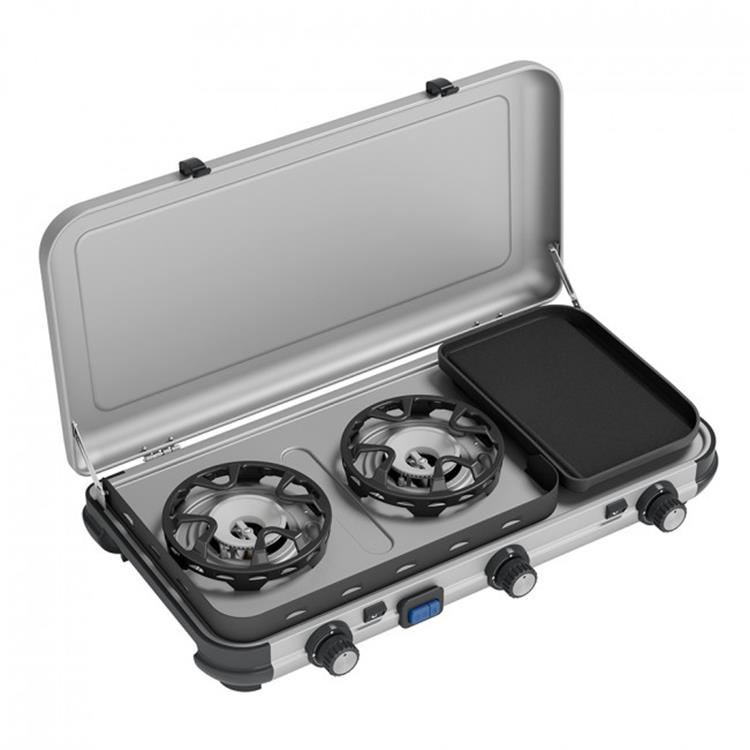 Il fornello Camping Kitchen 2 Multi-Cook, trasforma il tuo angolo cottura all'aperto in una vera e propria cucina gourmet. Le sue dimensioni compatte mettono in evidenza la sua incredibile versatilità: grazie ai tre bruciatori indipendenti e alla piastra in alluminio pressofuso, potrai cucinare contemporaneamente pietanze diverse, proprio come a casa tua.