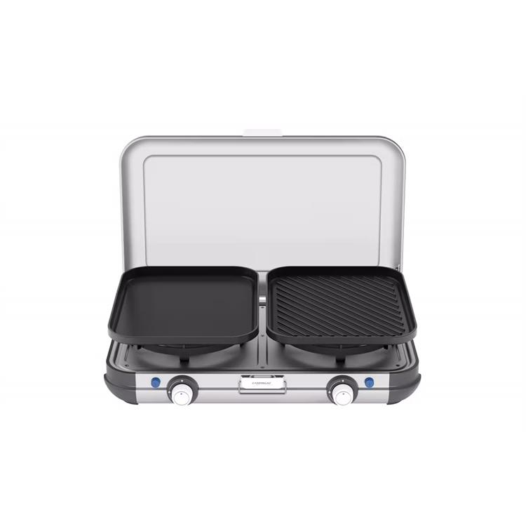 Camping Kitchen 2 Grill & Go è un prodotto che racchiude due fornelli da campeggio: dotato di 2 bruciatori e 2 griglie di cottura intercambiabili, offre la possibilità di preparare una vasta gamma di piatti.