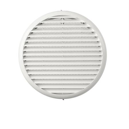 Griglia di ventilazione universale con rete antinsetti e molle di fissaggio per fori da ø 40 mm a ø 80 mm, realizzata in plastica ABS di colore bianco.