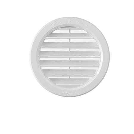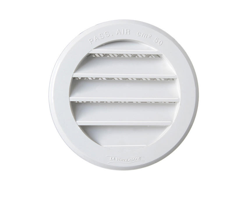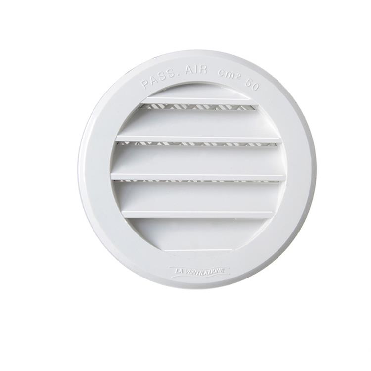 Griglia tonda da incasso in ABS, colore bianco, con diametro esterno di 96 mm e diametro foro di 77 mm. Dotata di rete antinsetti e spessore di 16 mm.