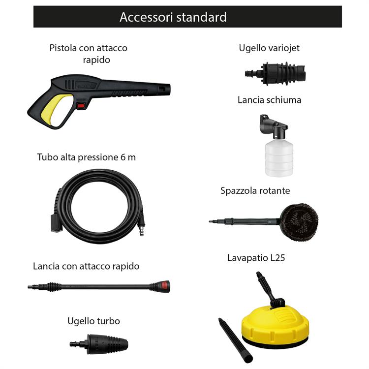 - Patio Cleaner incluso: Ideale come idropulitrice ad acqua fredda per pavimenti, questo accessorio permette di pulire grandi superfici orizzontali senza schizzi d'acqua.