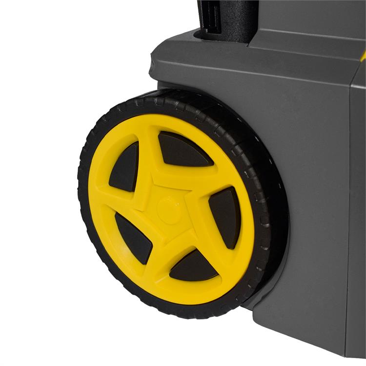 Le grandi ruote facilitano il trasporto dell'idropulitrice in diverse aree esterne. La dotazione completa include una pistola con attacco rapido, una lancia porta ugelli, un tubo alta pressione da 4 metri, una spazzola rotante per una pulizia più efficace delle superfici delicate, l'ugello turbo, l'ugello variojet e una lancia schiuma per l'applicazione di detergenti.