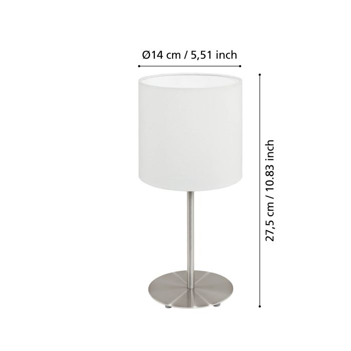 La lampada da tavolo di design PASTERI, con la sua base in metallo nichel opaco e il paralume cilindrico di stoffa bianca, è un elemento decorativo per l'illuminazione di casa. La lampada si accende e si spegne facilmente grazie a un interruttore sul cavo. Il suo design semplice la rende adatta a diversi tipi di arredamento e può essere posizionata in vari ambienti, come una lampada da tavolo soggiorno o una lampada da tavolo camera da letto. L'illuminazione che emana è adatta per creare un'atmosfera rilassata. La lampada è compatibile con qualsiasi lampadina con attacco E14, dandoti la libertà di scegliere la luminosità e la temperatura di colore che preferisci.