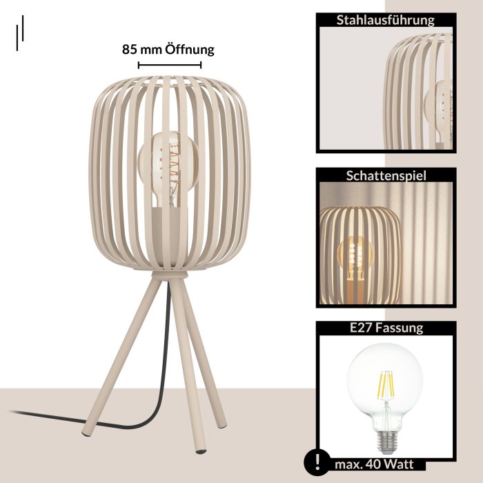 Romazzina è la lampada da tavolino Eglo dal design curato realizzata con una struttura in acciaio dalla finitura color sabbia. Questa lampada presenta un corpo a listelli verticali di forma tondeggiante che crea un affascinante gioco di luci e ombre. Il suo design raffinato la rende perfetta in ogni stanza, anche in camera da letto come lampada da comodino, oppure in studio, come lampada da scrivania.