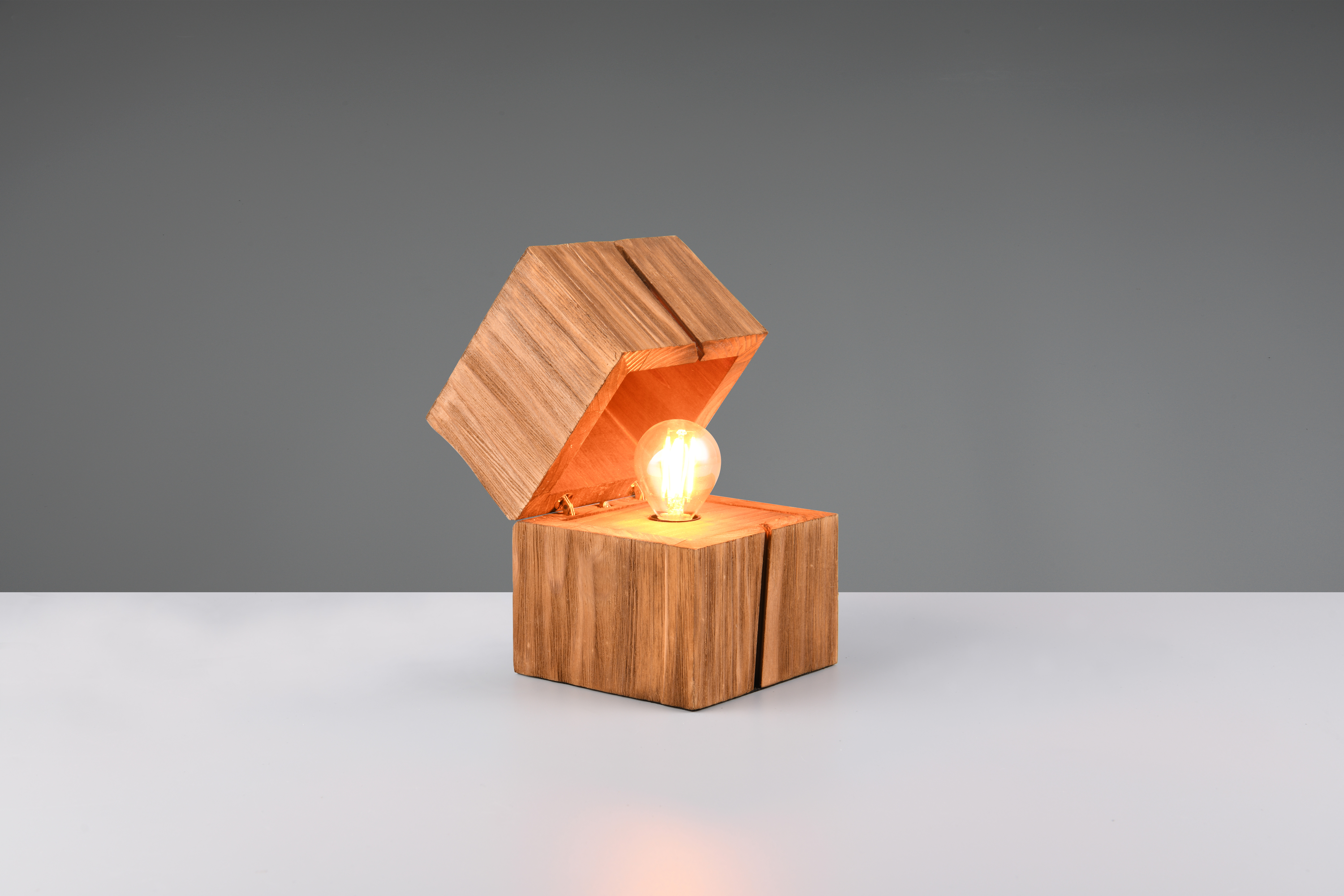 La luce rimane accesa fino alla chiusura dello scrigno, offrendo un'interazione magica e tattile. Grazie alle sue dimensioni contenute (12 × 12 × h16 cm), questa lampada in legno naturale è perfetta per integrarsi armoniosamente su mensole, librerie o come raffinata lampada da comodino a led.