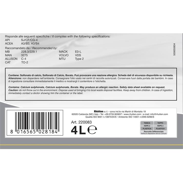 Specifiche: L'olio motore Rhutten 15W40 soddisfa le seguenti specifiche: API SJ/CF/CG-4 CAT TO-2 ACEA A3/B3/B4/E2 MACK EO-L MB 228.3/229.1 VOLVO VDS MAN 3275 MTU Type 2 ALLISON C-4.