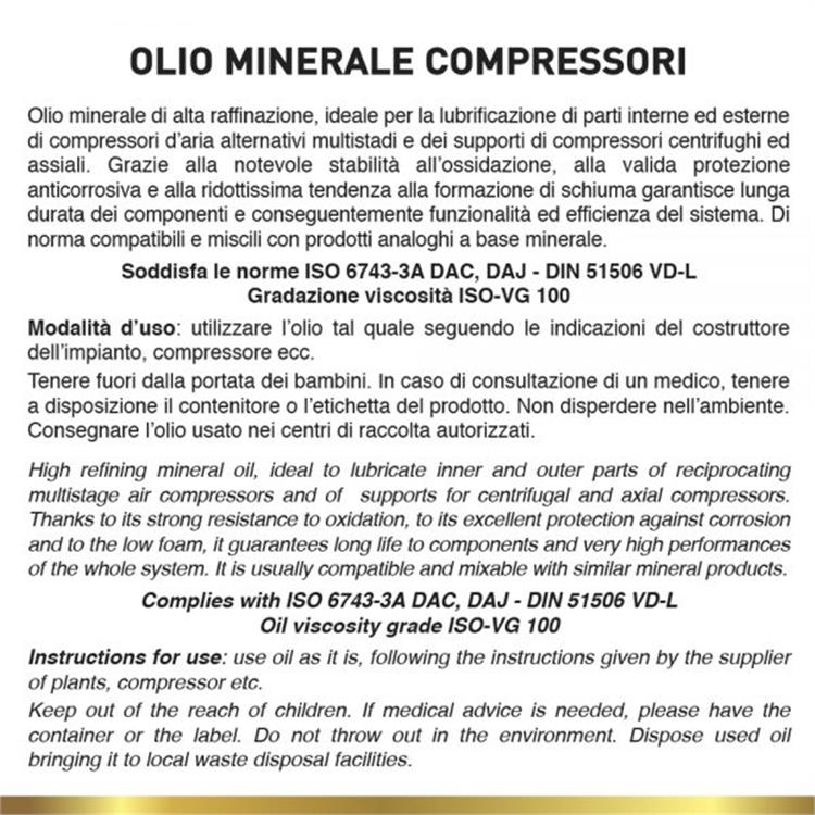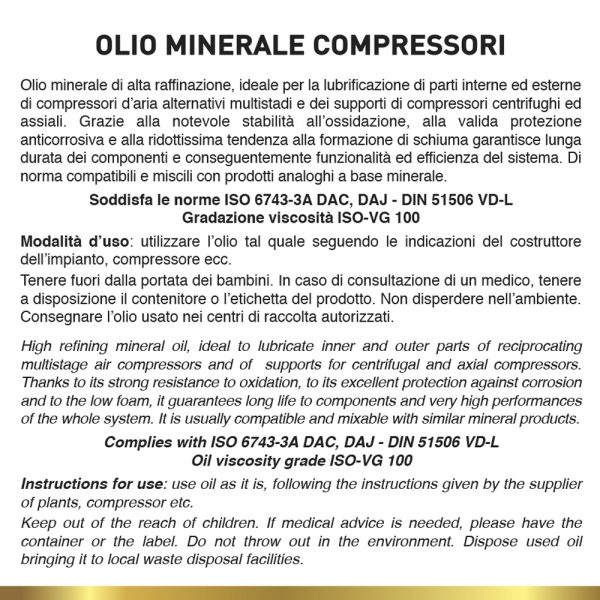 Olio per compressori Rhutten con formulazione a base di oli minerali altamente raffinati.