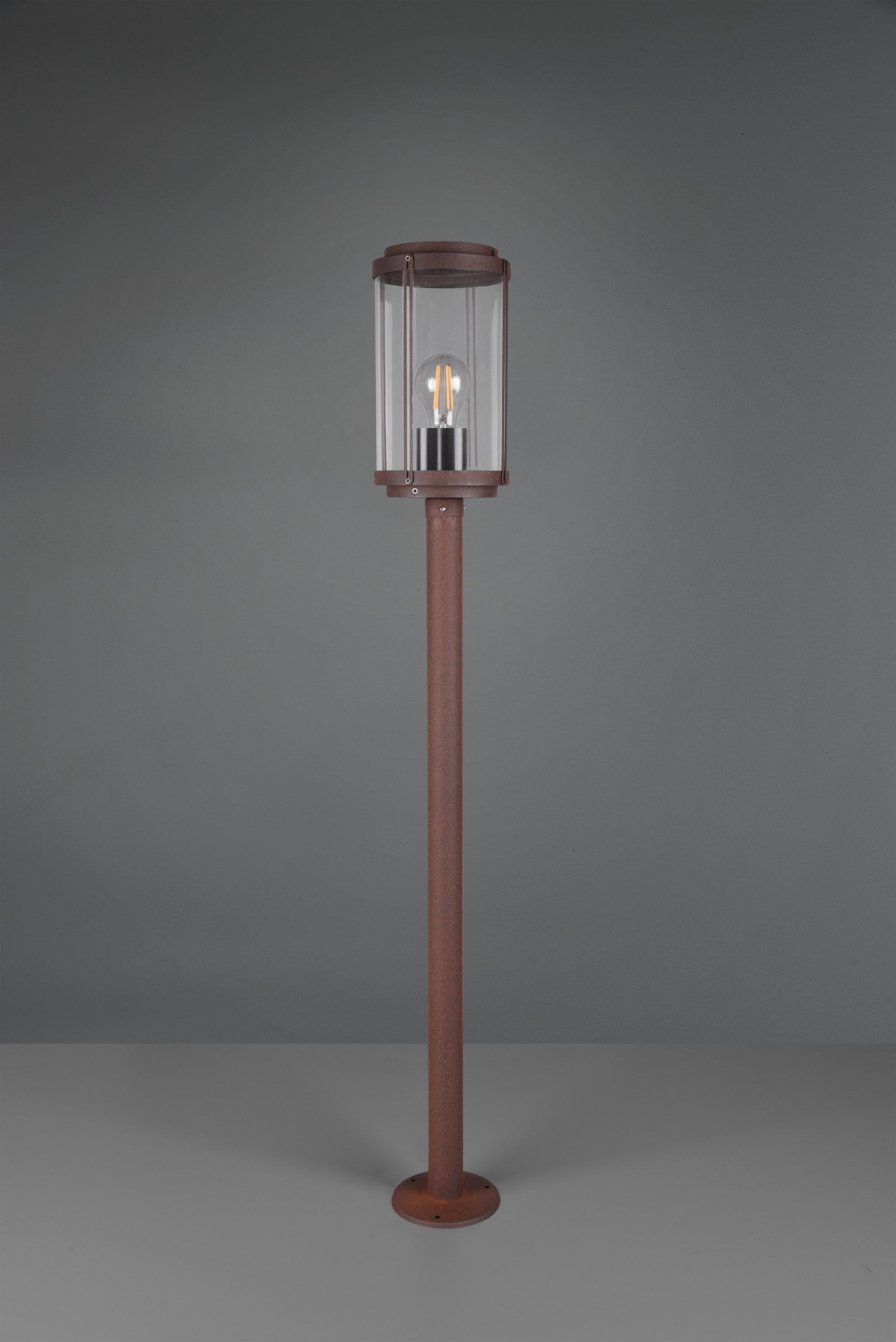 La moderna colorazione ruggine è abbinata al vetro trasparente del paralume, ben visibile e parte centrale del design di questo palo luce esterno (diametro di 14,5 cm e altezza di 24,5 cm).