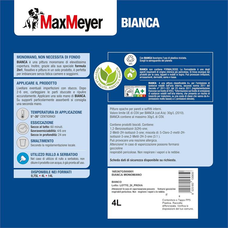 PITTURA LAVABILE PER INTERNI 2 IN 1 - BIANCA MONOMANO - 4 LT - MAXMEYER