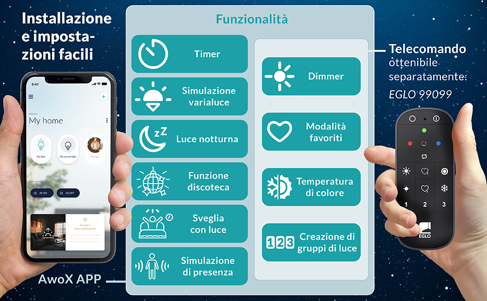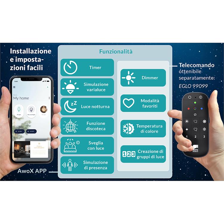 - Possibilità di controllo smart: molti prodotti, tra cui questa plafoniera Eglo, sono dotati di controlli smart per agevolare l'uso del prodotto e utilizzare funzioni avanzate.