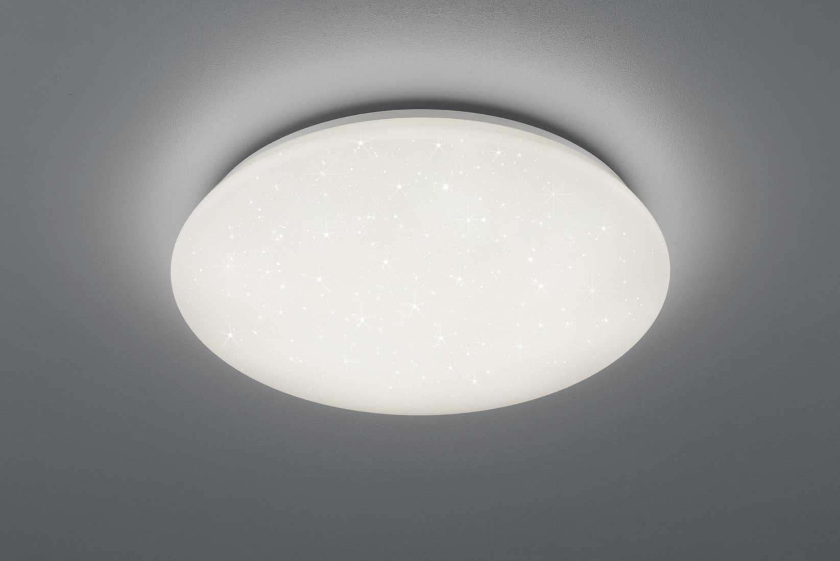 Plafoniera led 50 cm dall'effetto cielo stellato: Questa plafoniera rotonda di Trio Lighting, con un diametro di 50 cm, presenta una copertura effetto cielo stellato glitterato di tendenza che non solo offre un'illuminazione piacevole, ma crea anche effetti di luce originali nel vostro spazio abitativo.