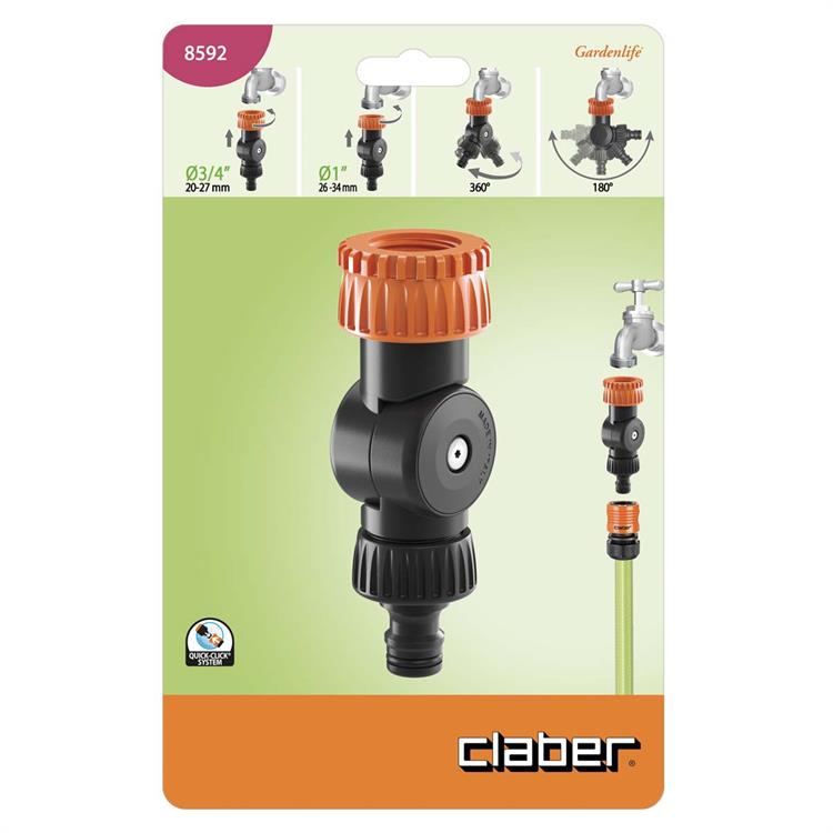 Semplicità e flessibilità: la presa rubinetto Claber si installa in pochi secondi su qualsiasi rubinetto filettato da 1” e 3/4”. Lo snodo a 180° e la rotazione a 360° del connettore finale garantiscono la massima flessibilità, evitando che il tubo si pieghi o si attorcigli.