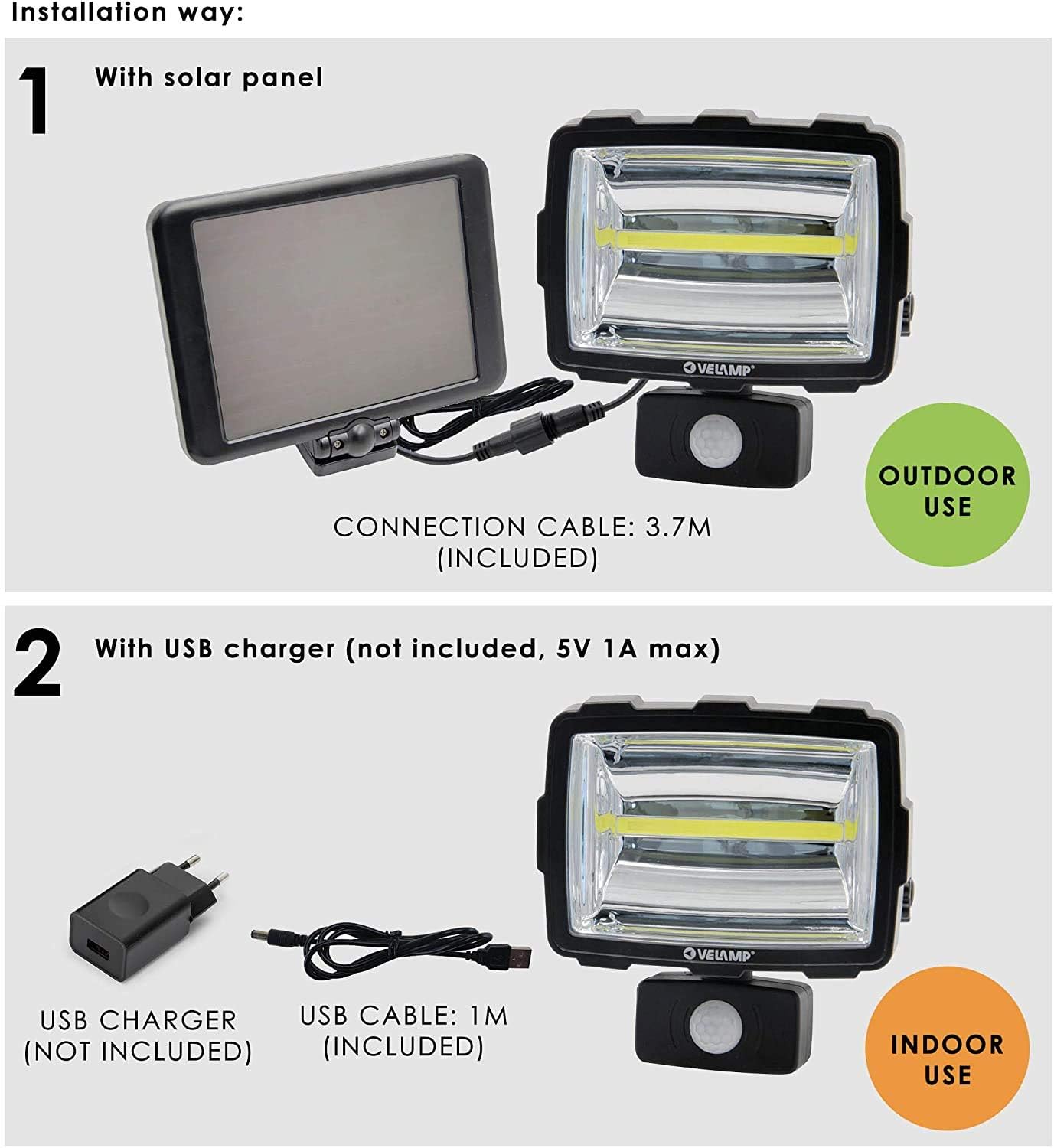 Il faretto LED con sensore di movimento viene fornito con un cavo USB. Questo ti permette di caricarlo comodamente dalla normale presa elettrica, ad esempio per poterlo utilizzare anche all'interno. Si collega a un normale caricatore 5V 1A (come quello che usi per lo smartphone). In questo modo sarà sempre operativo, anche all’interno e in zone non illuminate dalla luce solare.