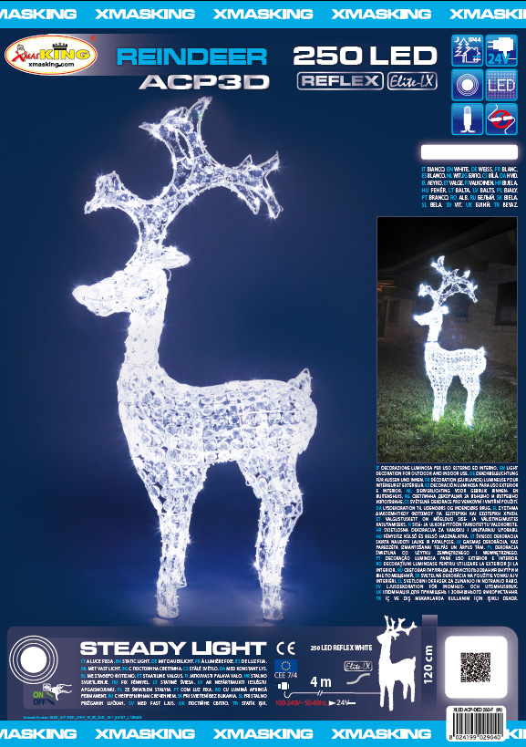 Questa renna natalizia 3D aggiunge una ventata di magia alle tue decorazioni di Natale! Realizzata con cristalli in acrilico e illuminata da 250 LED bianchi a luce fissa, questa splendida decorazione è il complemento perfetto per il tuo giardino o per gli interni della tua casa!