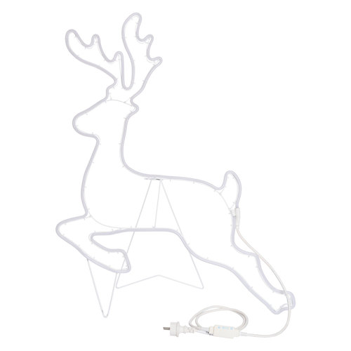 La renna raffigurata in un elegante movimento al galoppo è composta si caratterizza per un design elegante e moderno. Misura 85 cm di altezza e presenta un telaio in metallo verniciato bianco che garantisce resistenza e durata nel tempo. È illuminata da 480 LED SDM stile neon bi-facciale. Luce fissa di color bianco caldo, che diffonde una calda e accogliente luminosità, creando un'atmosfera festosa e invitante.