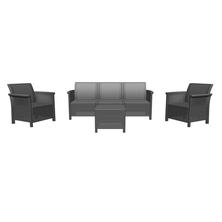 Realizzato in resistente polipropilene con effetto rattan, questo salotto da giardino è specificamente progettato per l'uso esterno. È altamente resistente agli agenti atmosferici e protetto dai raggi UV, garantendo che il suo colore antracite rimanga brillante nel tempo senza sbiadire.