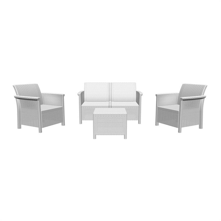 Realizzato in resistente polipropilene con effetto rattan, questo salotto da giardino è specificamente progettato per l'uso esterno. È altamente resistente agli agenti atmosferici e protetto dai raggi UV, garantendo che il suo colore bianco rimanga brillante nel tempo senza sbiadire.