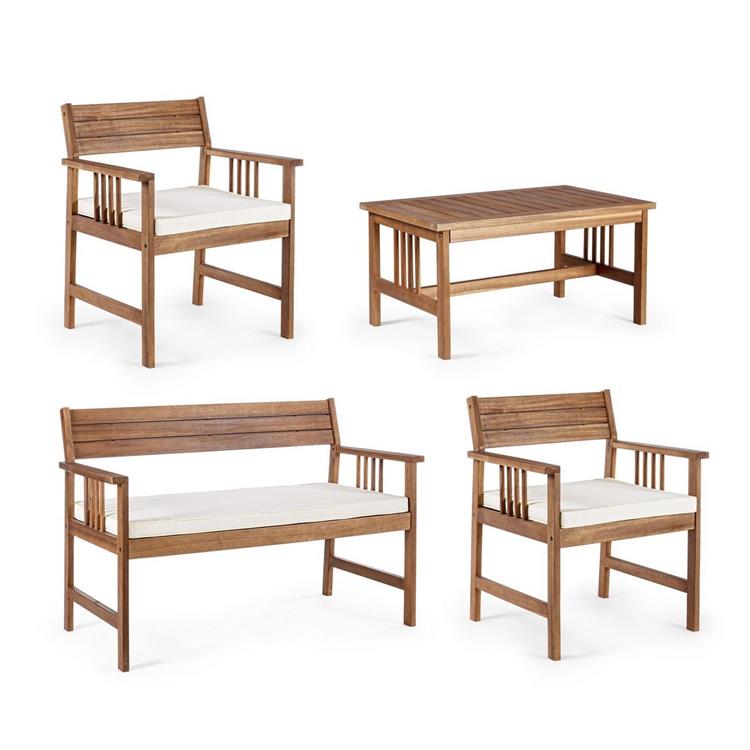 - Salotto da giardino realizzato con legno di acacia e viteria in acciaio galvanizzato per resistenza e durabilità.