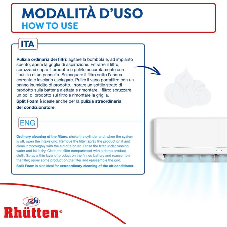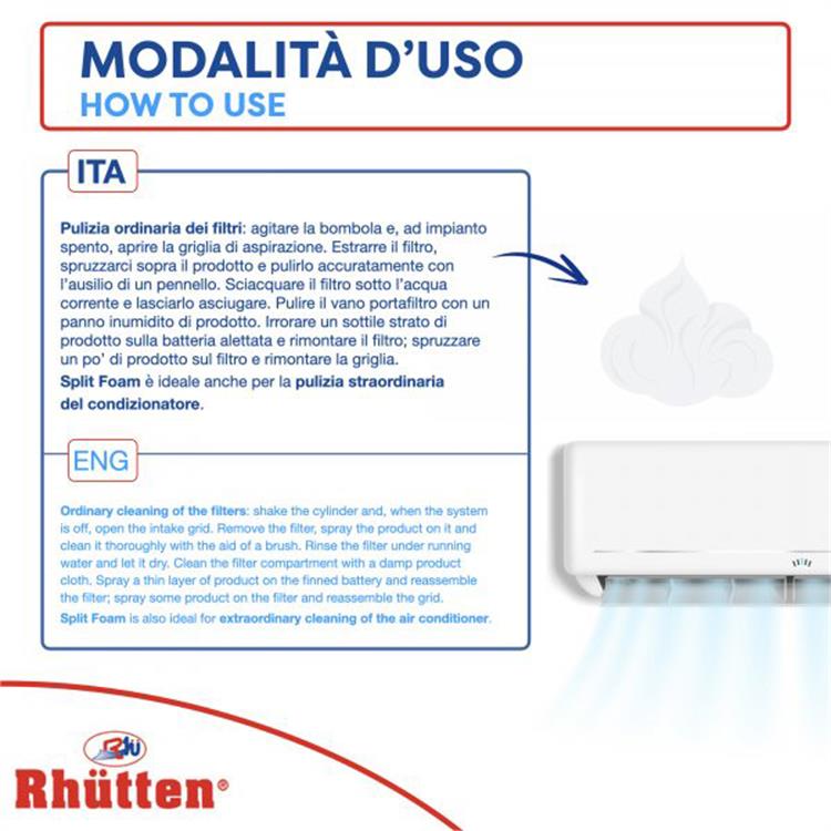 Modalità d’uso: Pulizia ordinaria dei filtri: agitare la bombola e, a impianto spento, aprire la griglia di aspirazione. Estrarre il filtro e spruzzarci sopra il prodotto, quindi pulirlo accuratamente con l’ausilio di un pennello. Sciacquare il filtro sotto l’acqua corrente e lasciarlo asciugare. Pulire il vano portafiltro con un panno inumidito di prodotto. Irrorare un sottile strato di prodotto sulla batteria alettata e rimontare il filtro; spruzzare un po’ di Split Foam sul filtro e rimontare la griglia.