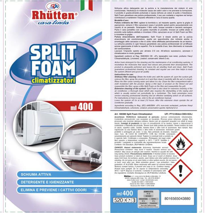 Pulizia straordinaria dell’impianto: Split Foam è ideale anche per la pulizia straordinaria del condizionatore, ossia quella più approfondita che richiede anche lo smontaggio della carcassa e che, di solito, viene effettuata periodicamente da un tecnico. La schiuma penetra in ogni fessura garantendo una pulizia professionale ed un’efficace azione igienizzante di tutte le superfici. Per le modalità d’uso, fare riferimento al manuale del condizionatore. Lasciare l’impianto spento per almeno 2-3 ore. All’utilizzo successivo, azionare il climatizzatore in modo graduale.