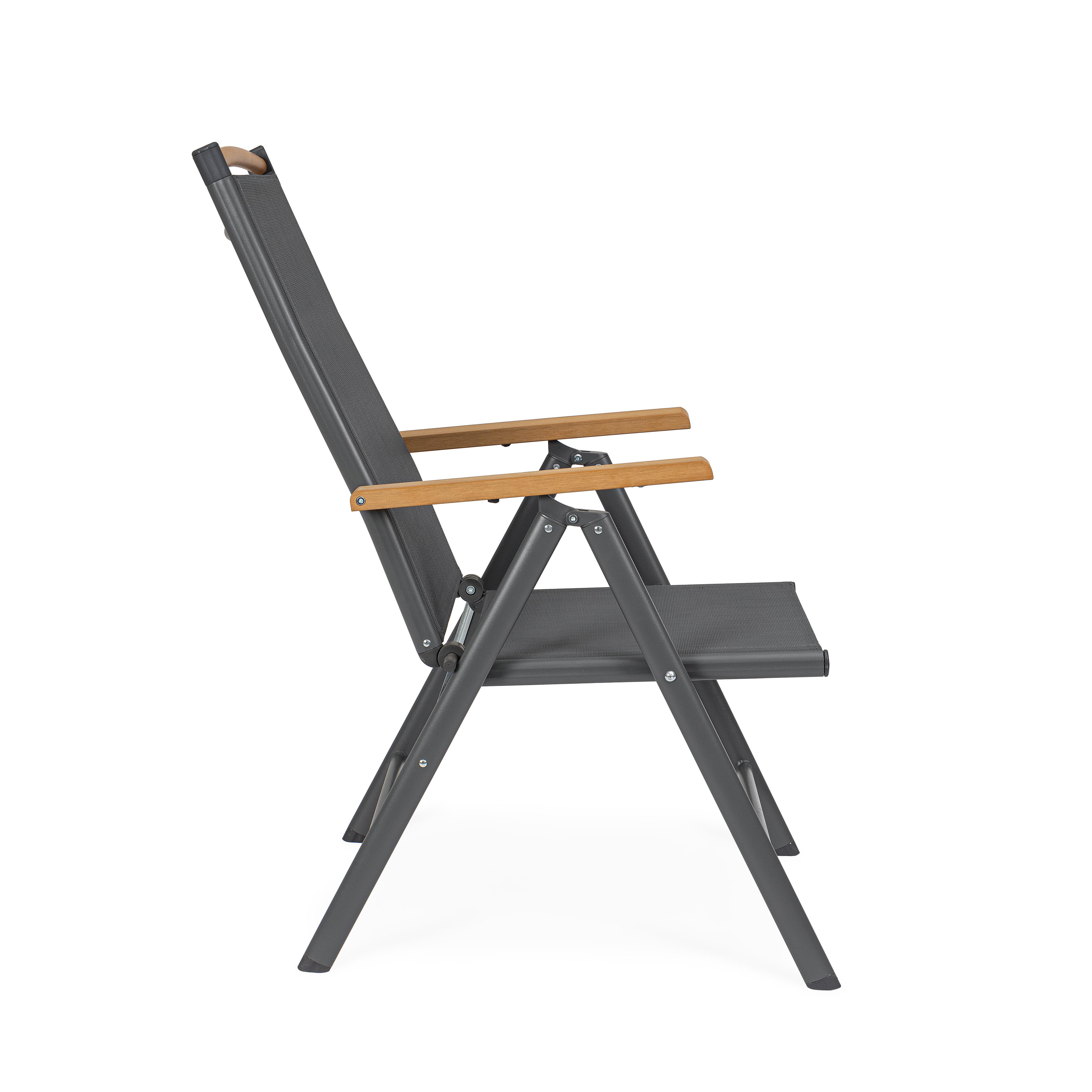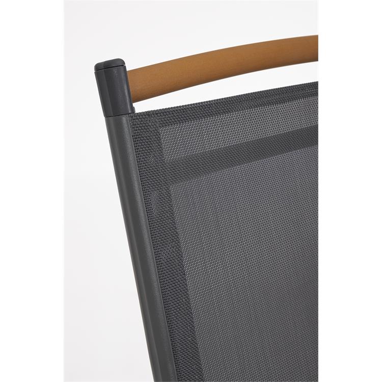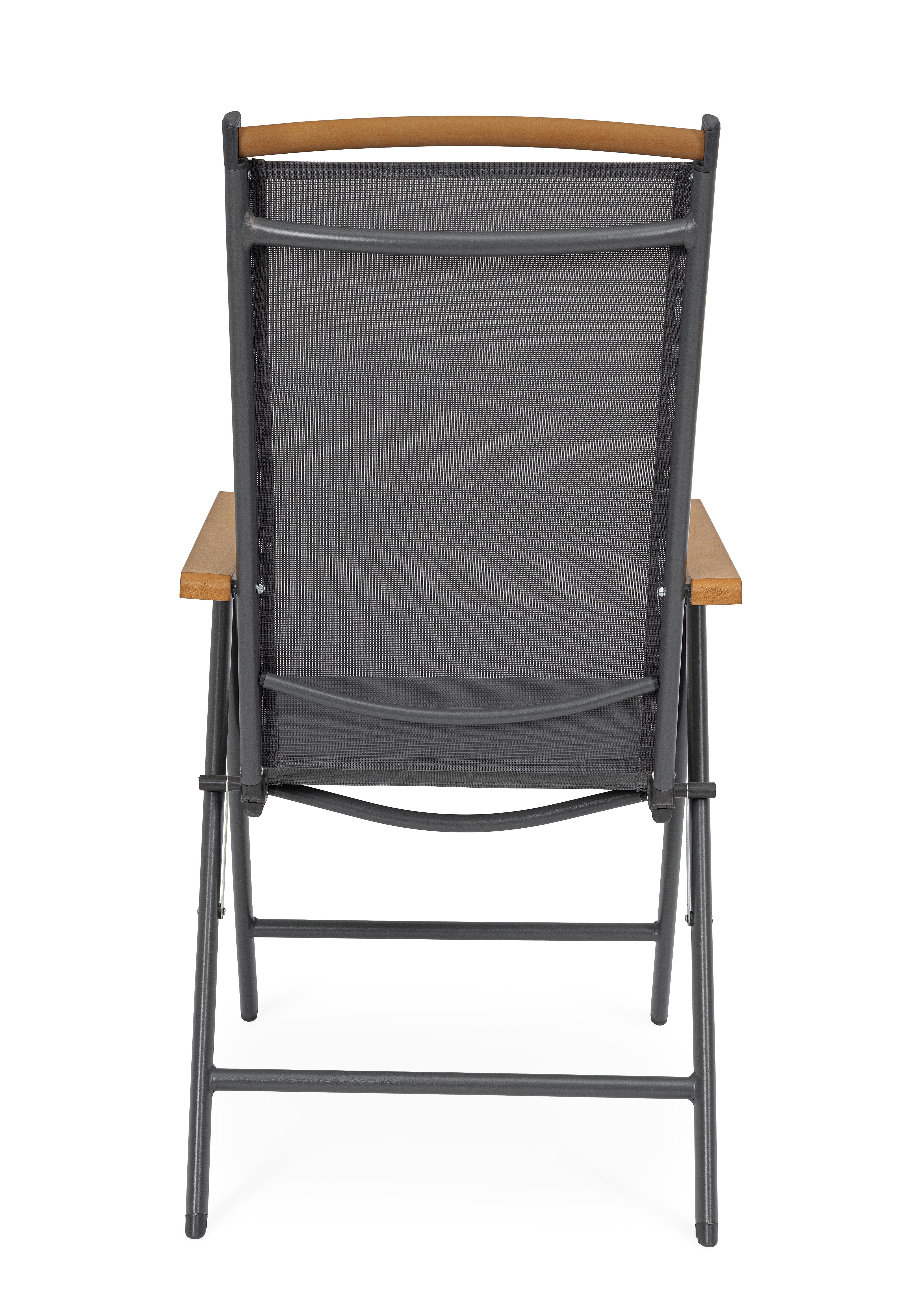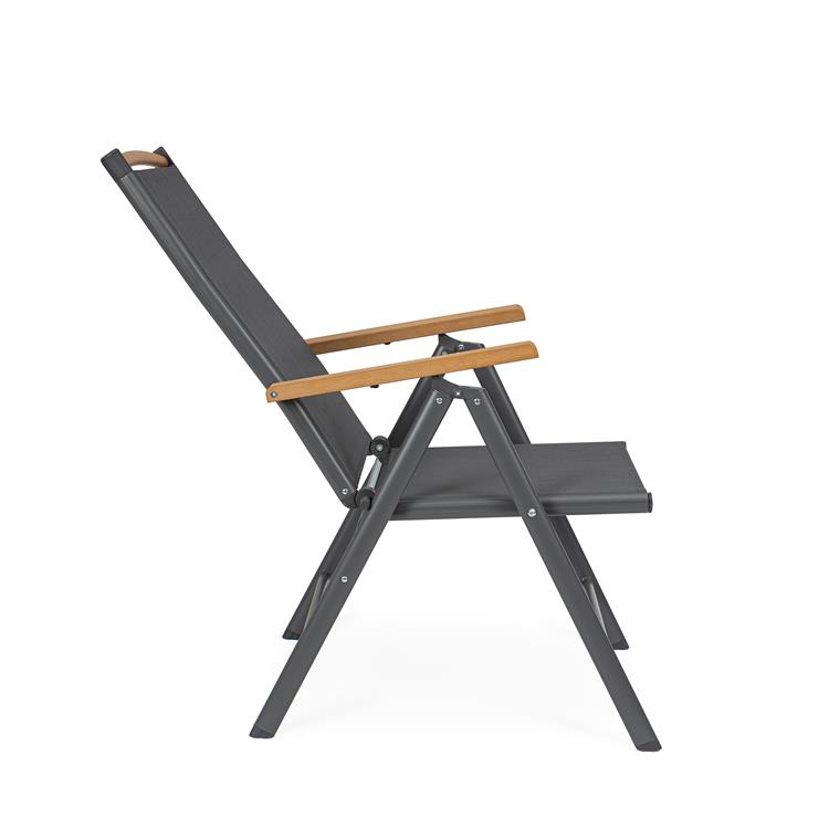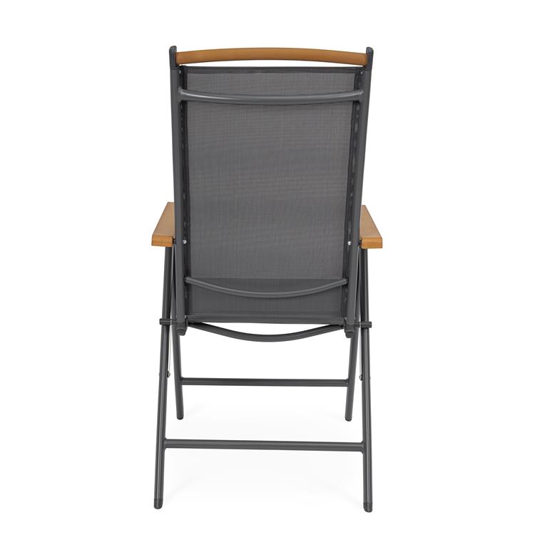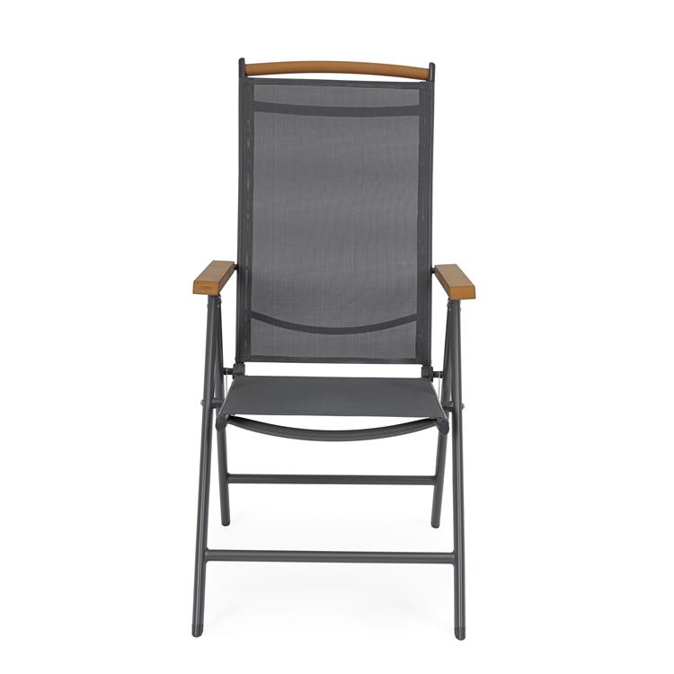La seduta e lo schienale, realizzati in textilene 2x1, assicurano traspirabilità e comfort anche nelle giornate più calde.