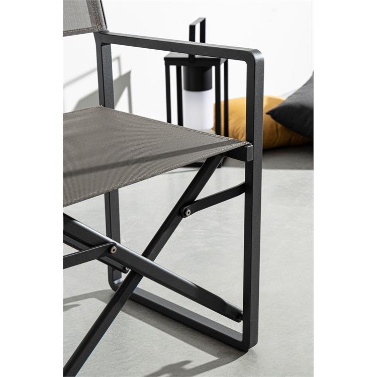 sedia regista in alluminio Bizzotto Taylor grigia offre comfort e praticità con la sua struttura in alluminio verniciato a polvere (poliestere). La seduta e lo schienale sono realizzati in textilene 2x1 (610g/m2) con cuciture termosaldate, mentre le viti sono in acciaio galvanizzato. Pieghevole e di colore grigio scuro, questa sedia da regista è un prodotto di qualità