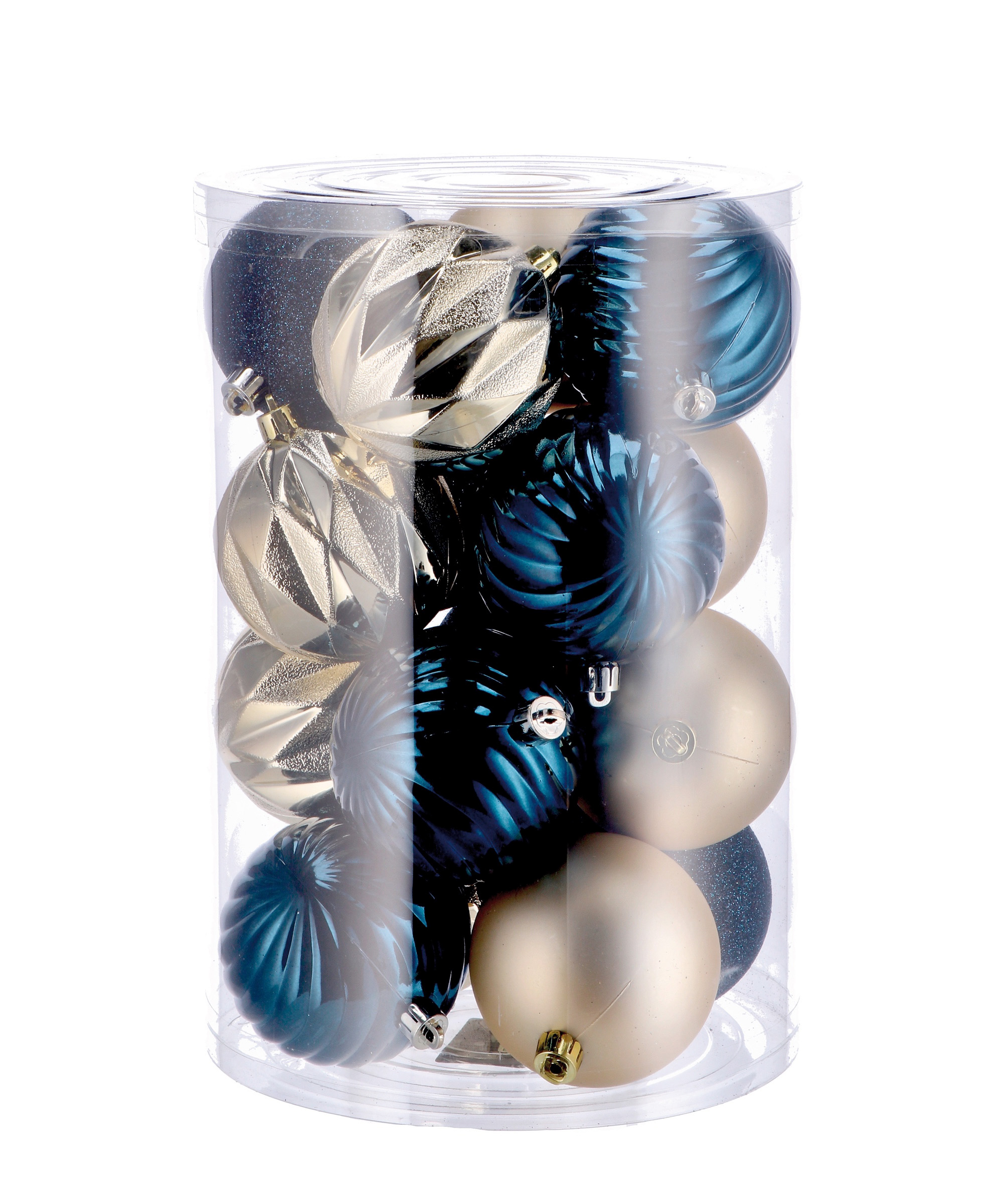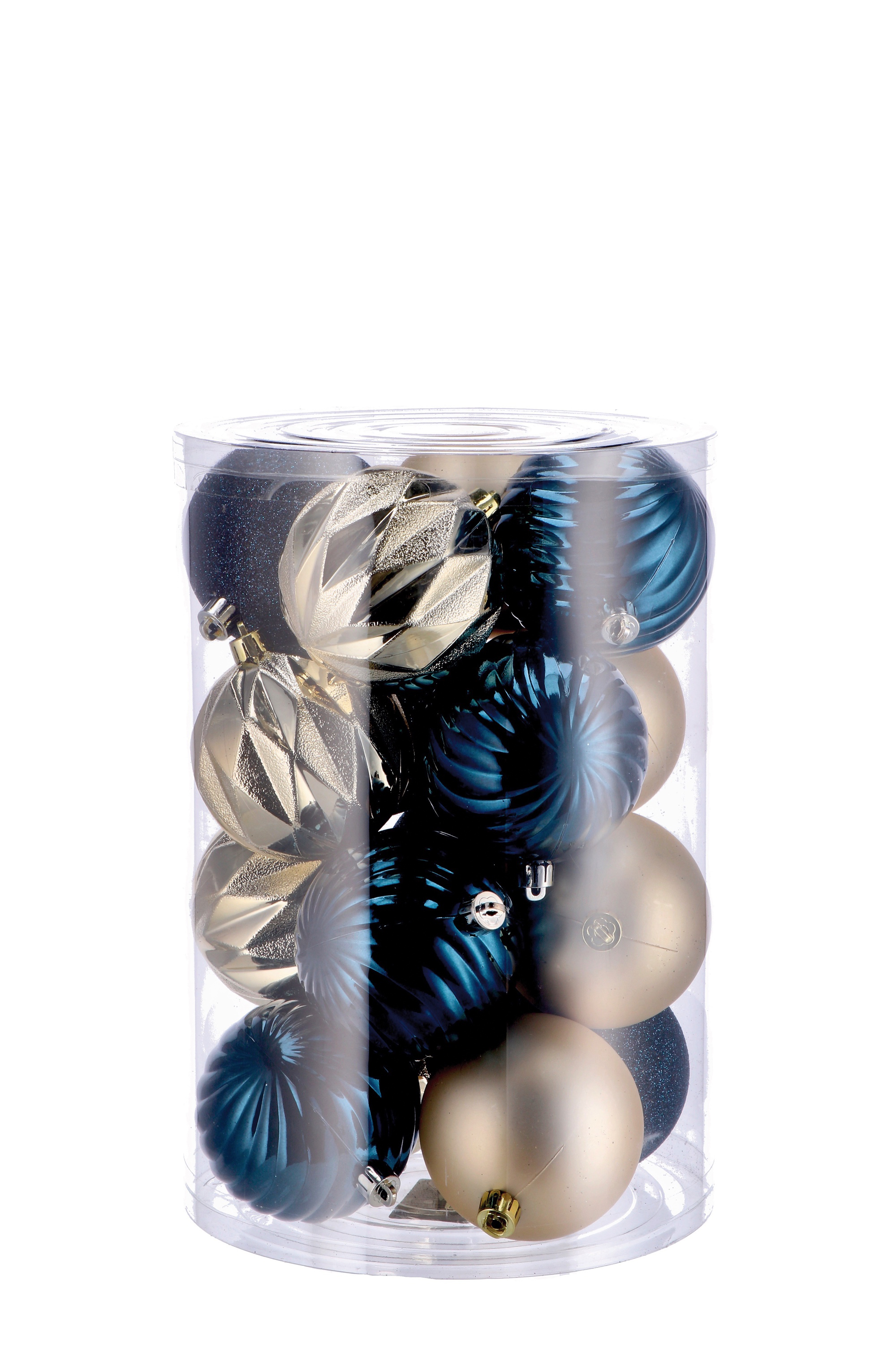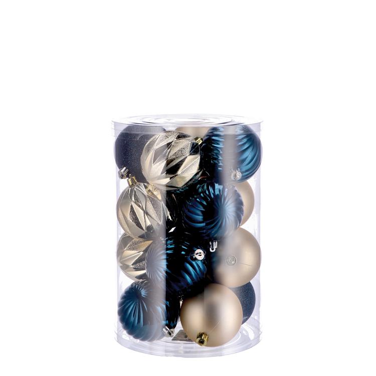 Crea un'atmosfera festosa e raffinata con il set di 16 palline natalizie in plastica. Realizzate in un elegante combinazione di oro e blu, queste palle di Natale sono perfette per decorare il tuo albero.