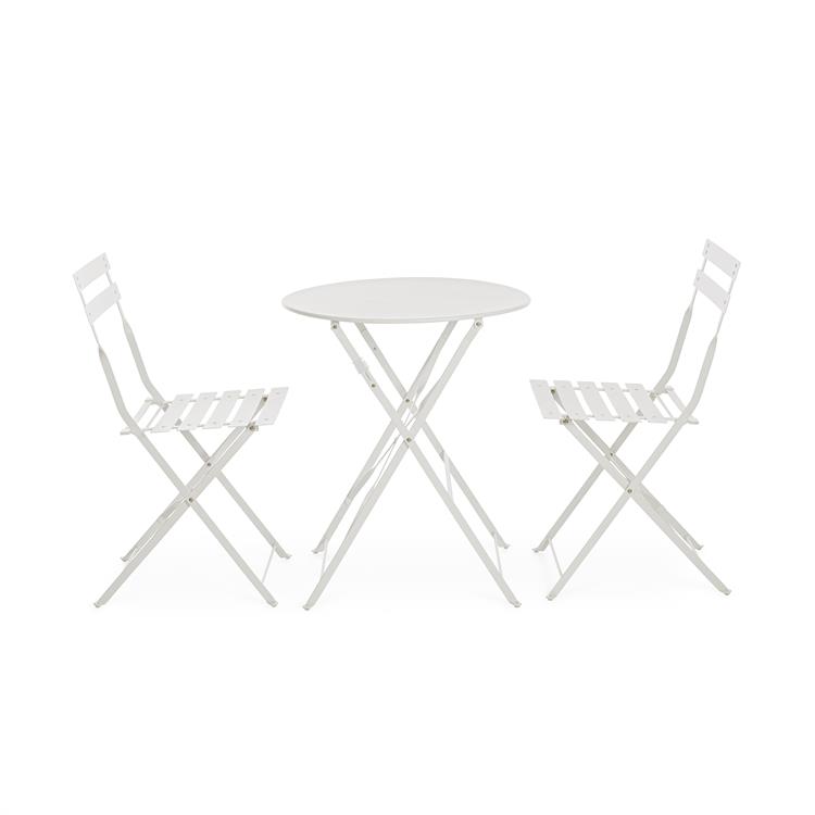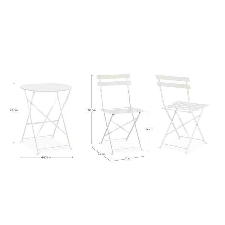 Arreda con intelligenza e stile il tuo balcone, terrazzo, o un piccolo angolo del giardino con questo funzionale set in acciaio bianco. Il set da balcone Bistrot di Bizzotto, composto da un tavolo rotondo e due sedie coordinate; è la soluzione perfetta per chi ha poco spazio ma non vuole rinunciare a un'area dedicata al relax o a un pasto all'aperto.