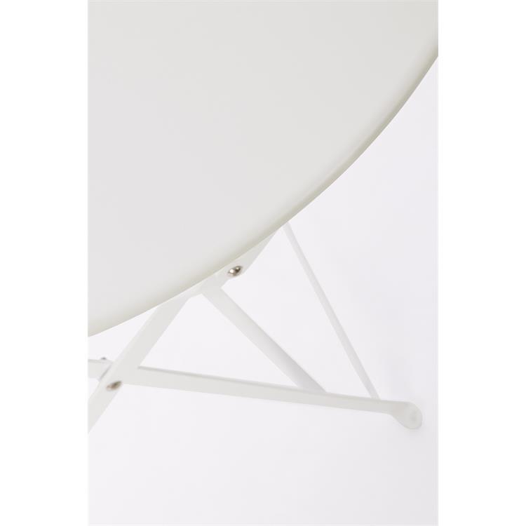 La robustezza e la durabilità sono assicurate dal materiale di costruzione: acciaio trattato specificamente per uso esterno tramite il processo E-coating e verniciatura a polvere (poliestere). Questa combinazione di trattamenti protegge efficacemente il set dagli agenti atmosferici e dalla ruggine, assicurandone la longevità. La finitura opaca di colore bianco conferisce al set un look moderno, pulito e minimalista, facile da integrare in qualsiasi ambiente esterno. Il tavolo rotondo aggiunge un tocco di morbidezza al design complessivo.