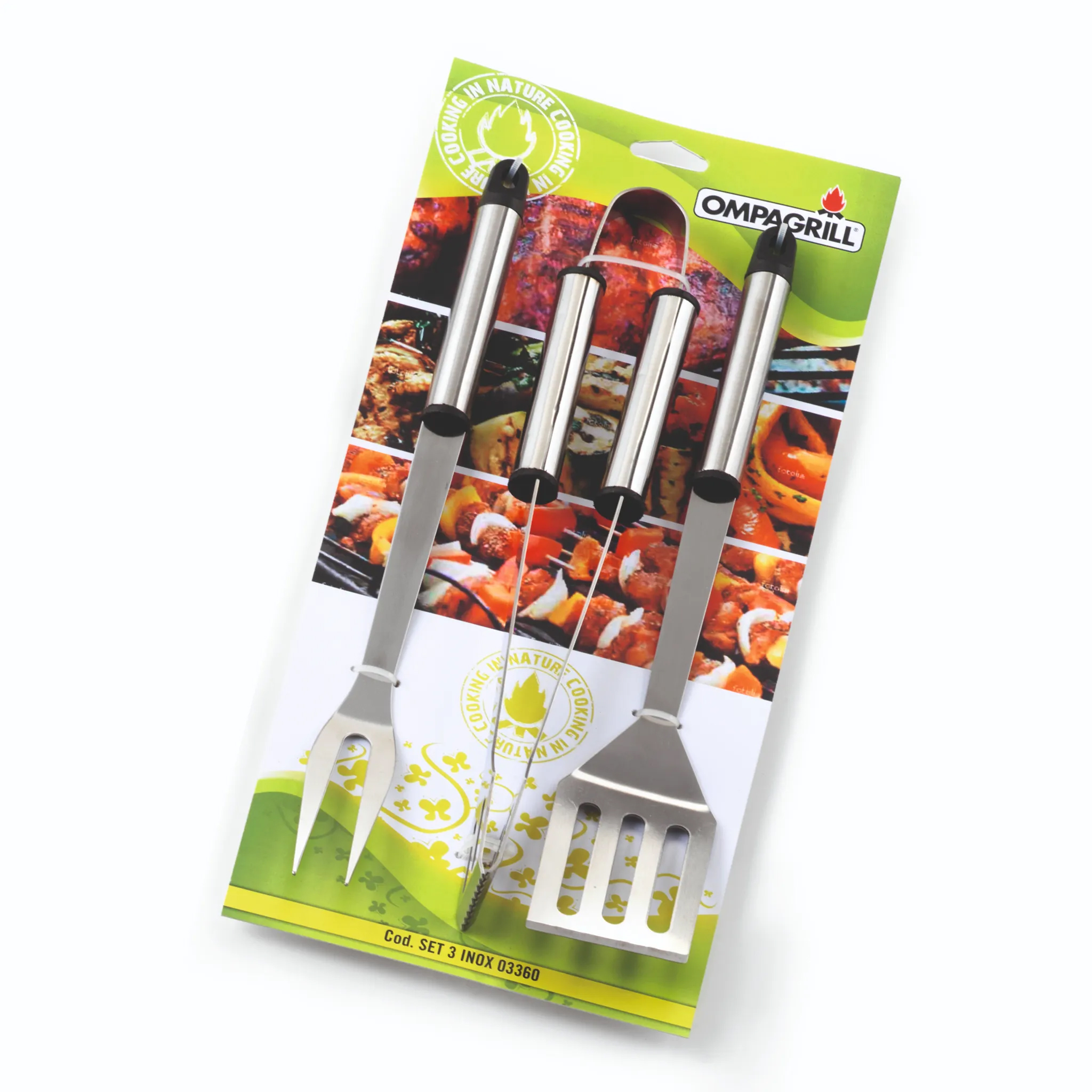 Set da 3 pezzi in acciaio inox Ompagrill, presentato in un blister di cartone con grafiche a tema "Cooking in Nature". OMPAGRILL promuove costantemente un approccio responsabile nei confronti dell’ambiente.