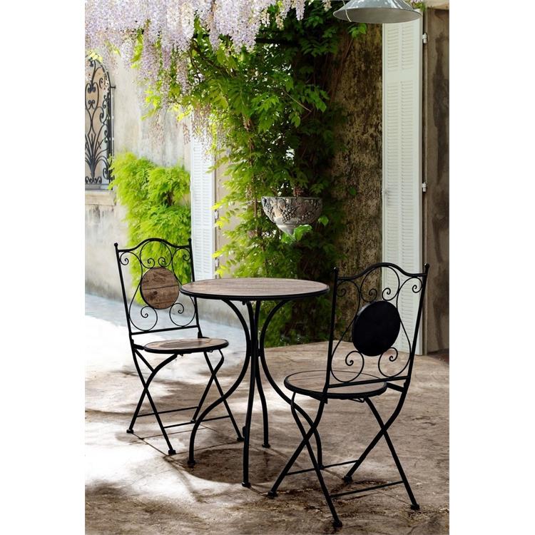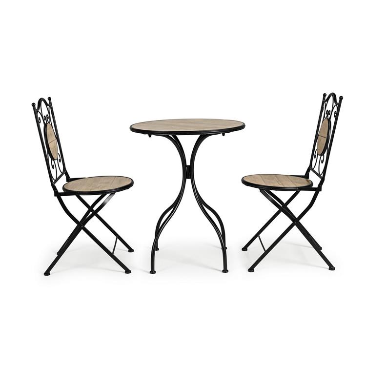 sedie pieghevoli, caratterizzati da una struttura in acciaio trattato per l'esterno con e-coating e verniciato a polvere epossidica. Il piano, la seduta e i decori sono realizzati in ceramica. Le sedie sono pieghevoli per una facile conservazione, mentre le gambe del tavolo richiedono assemblaggio.