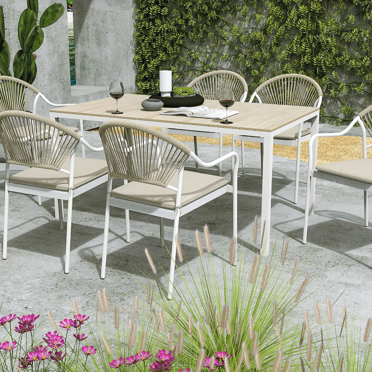 Lasciati affascinare dal raffinato set da giardino Rodi, il tavolo da giardino con sedie e top effetto legno per vivere appieno ogni momento all'aperto..