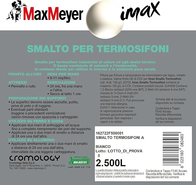 Lo Smalto per Termosifoni MaxMeyer è un prodotto specifico, formulato con resine inalterabili al calore e agli sbalzi termici, specificamente studiato per la verniciatura di radiatori in ferro, ghisa e alluminio. Grazie alla sua formulazione, questa vernice per termosifone garantisce una finitura satinata resistente e duratura nel tempo, anche in condizioni di elevata temperatura.
