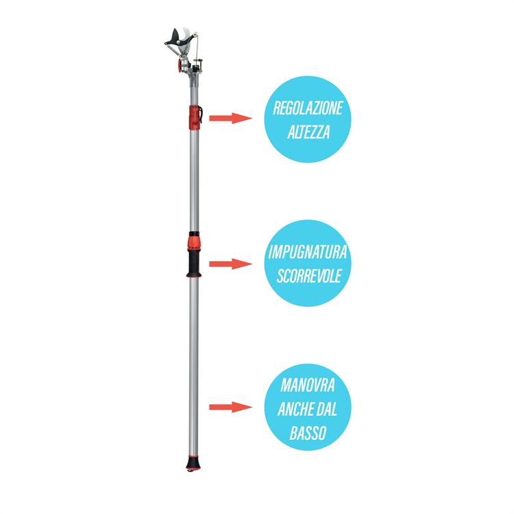 Con un'estensione che va da 200 a 365 centimetri, questo svettatoio telescopico professionale è la soluzione ideale per raggiungere in sicurezza anche i rami più distanti, evitando l'impiego di scale