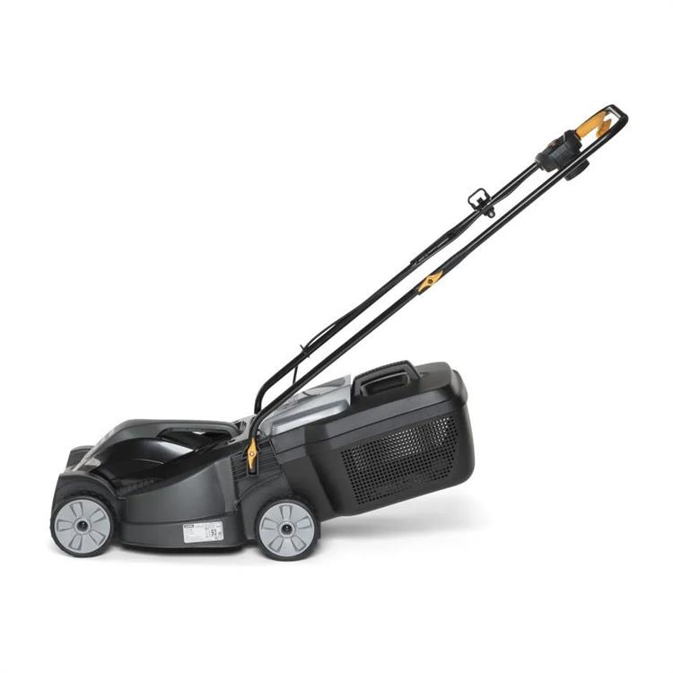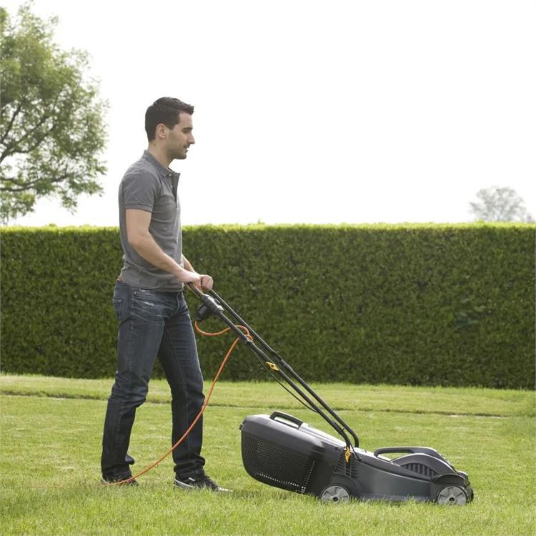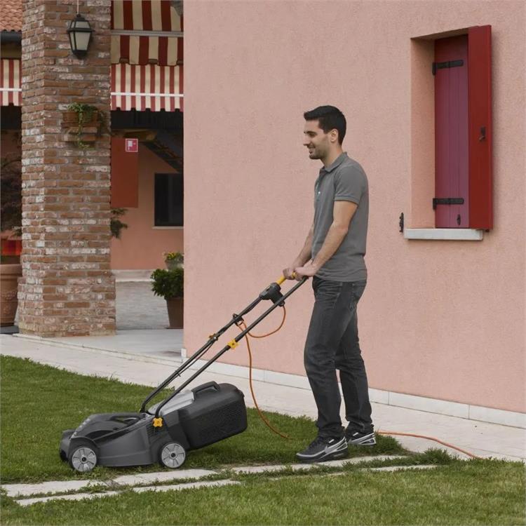 Il manico ergonomico è ripiegabile per facilitare il trasporto e lo stoccaggio ed è corredato di una pratica leva interruttore. Le ruote scolpite assicurano un'ottima aderenza al terreno, anche in presenza di erba bagnata.