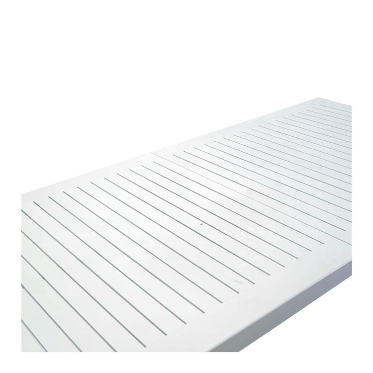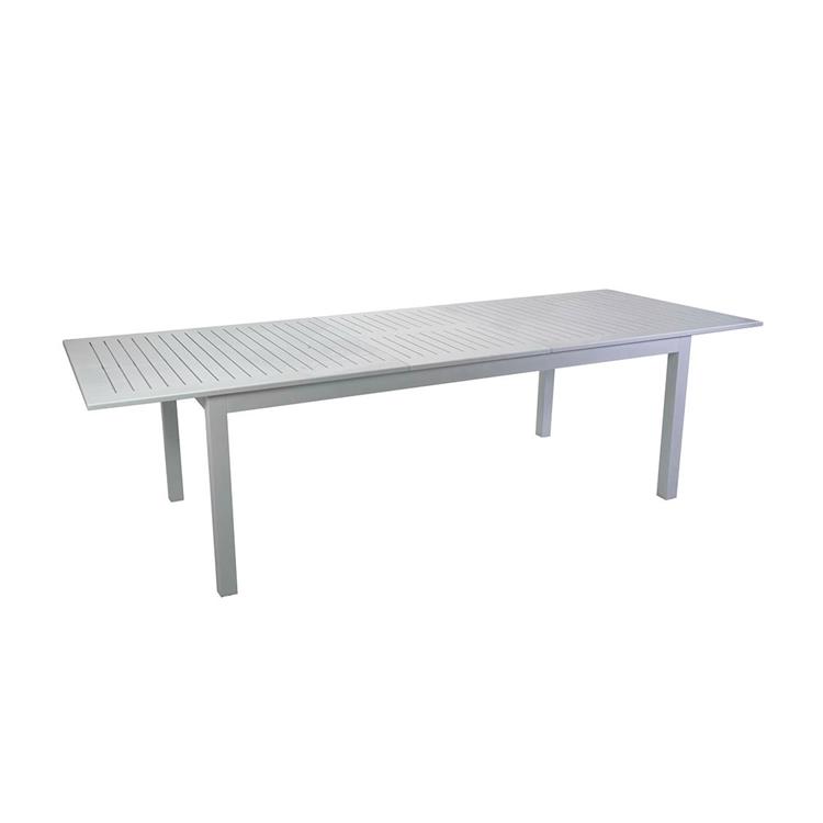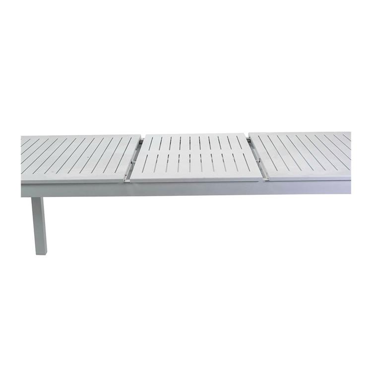 Realizzato interamente in alluminio verniciato a polvere di colore bianco, il tavolo Monterey combina leggerezza e robustezza eccezionali. L'alluminio è un materiale resistente alla corrosione e agli agenti atmosferici, garantendo una durabilità superiore e una manutenzione minima. L'elegante top a doghe aggiunge un tocco di modernità, mentre il sistema di allunga a farfalla con guide di scorrimento assicura una veloce transizione tra le lunghezze a disposizione.